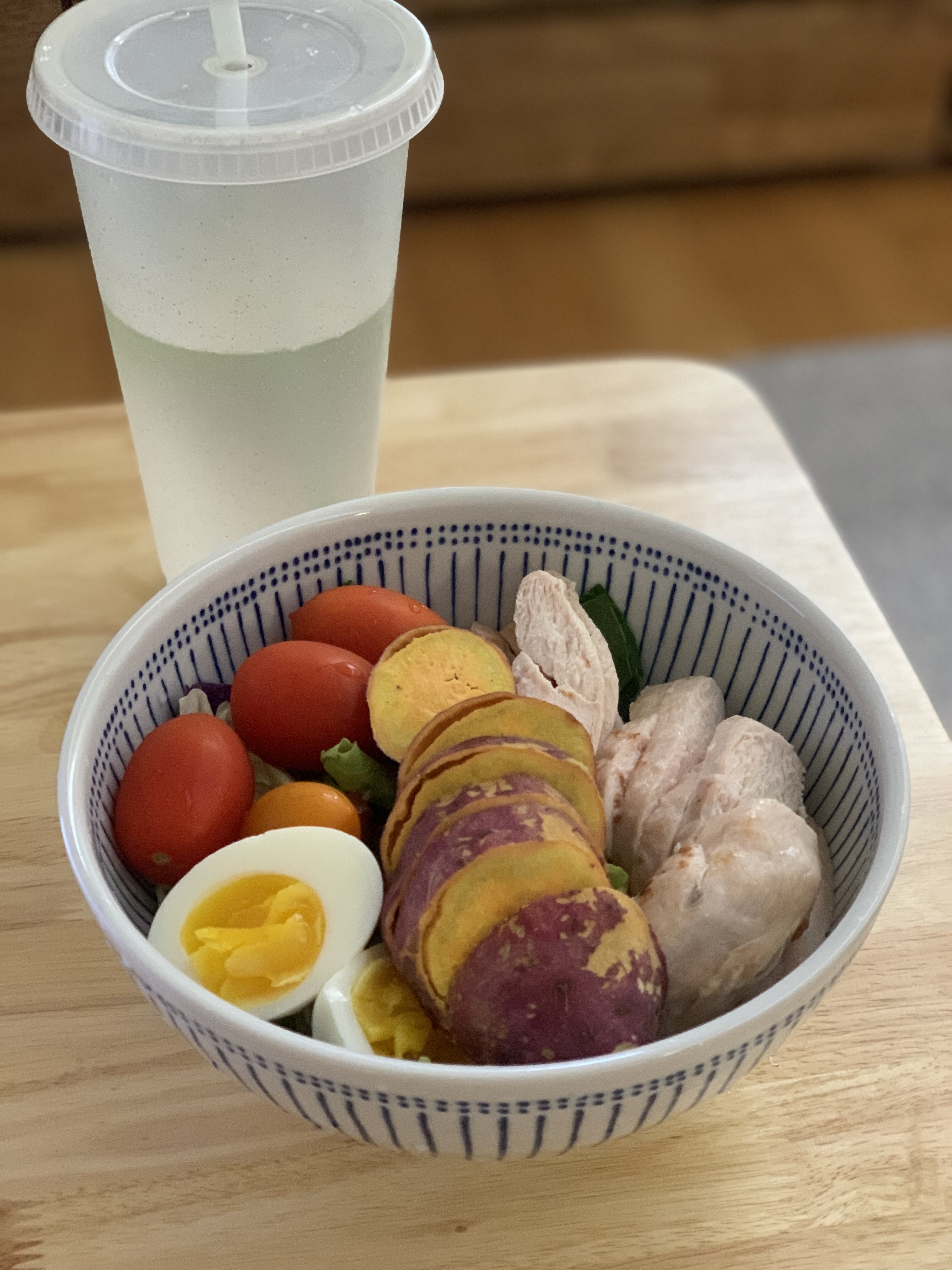 샐러드 + 방울토마토 + 반숙계란 1 + 닭가슴살 130g + 고구마 80g + 물