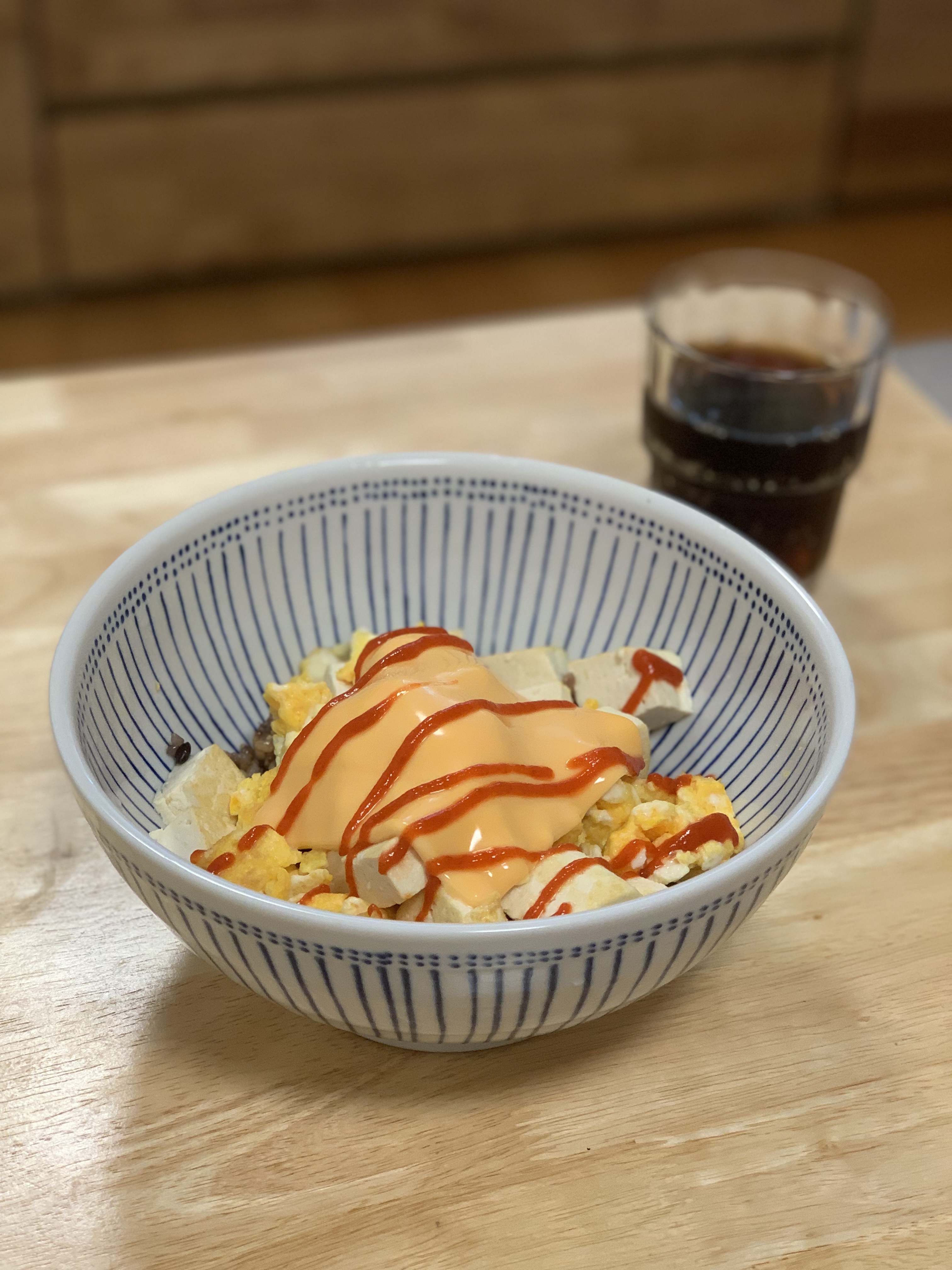 두부달걀덮밥: 두부 100g + 달걀 2 + 귀리곤약밥 100g + 치즈슬라이스 + 스리라차소스 + 제로팹시