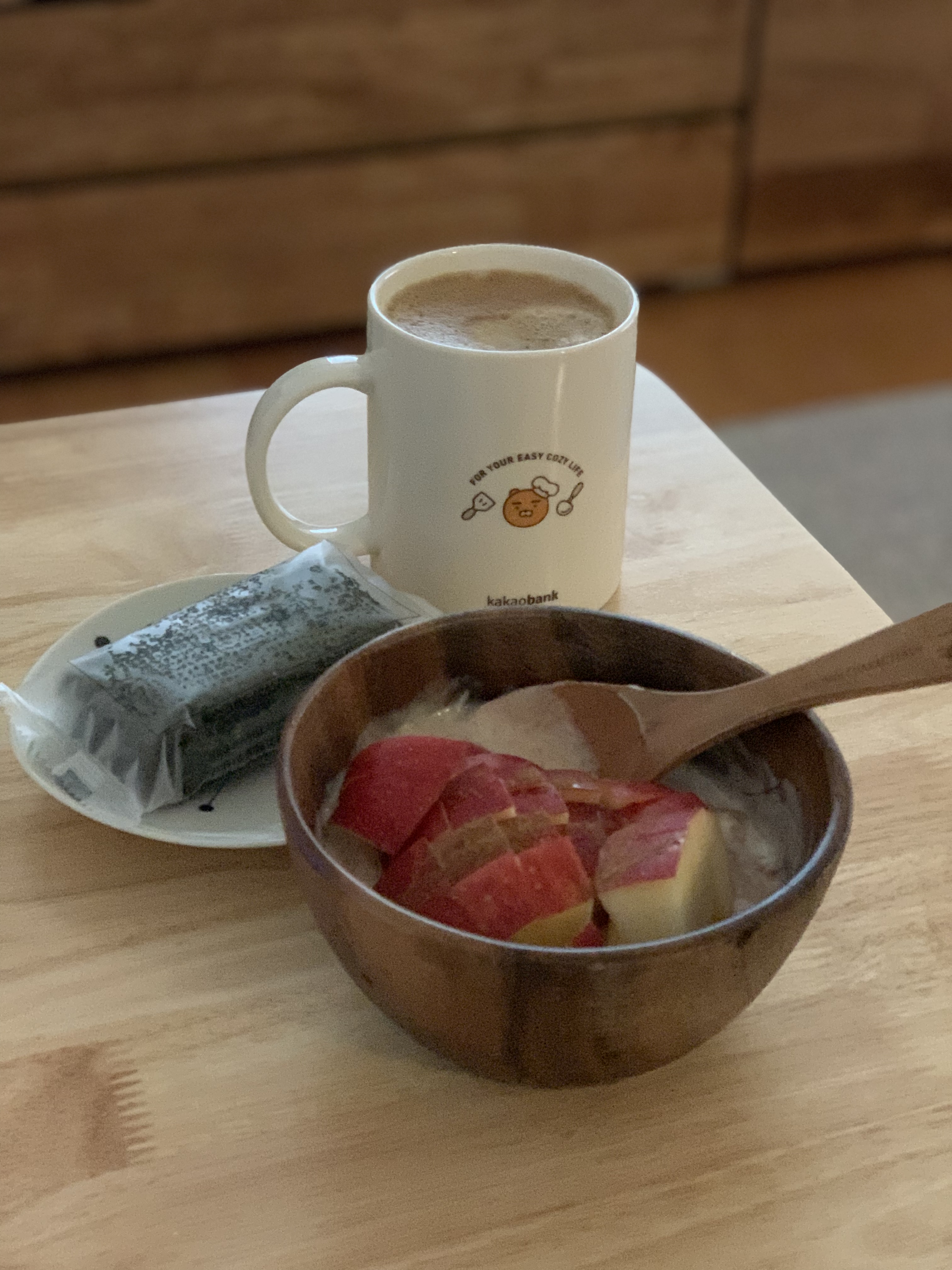 플레인요거트 100g + 프로틴파우더 20g+ #머드스콘 오트밀바 + 사과 1/4 + 커피