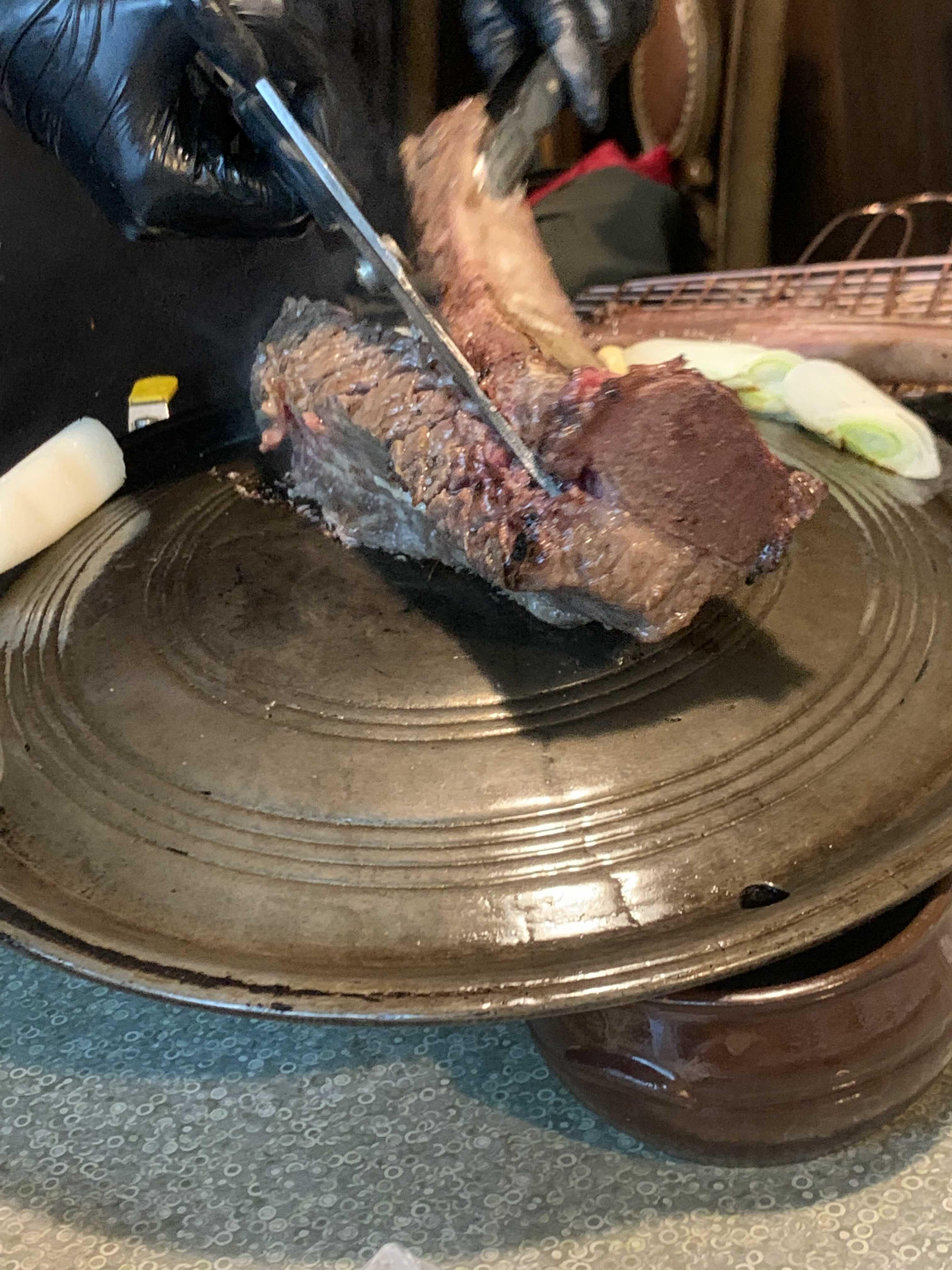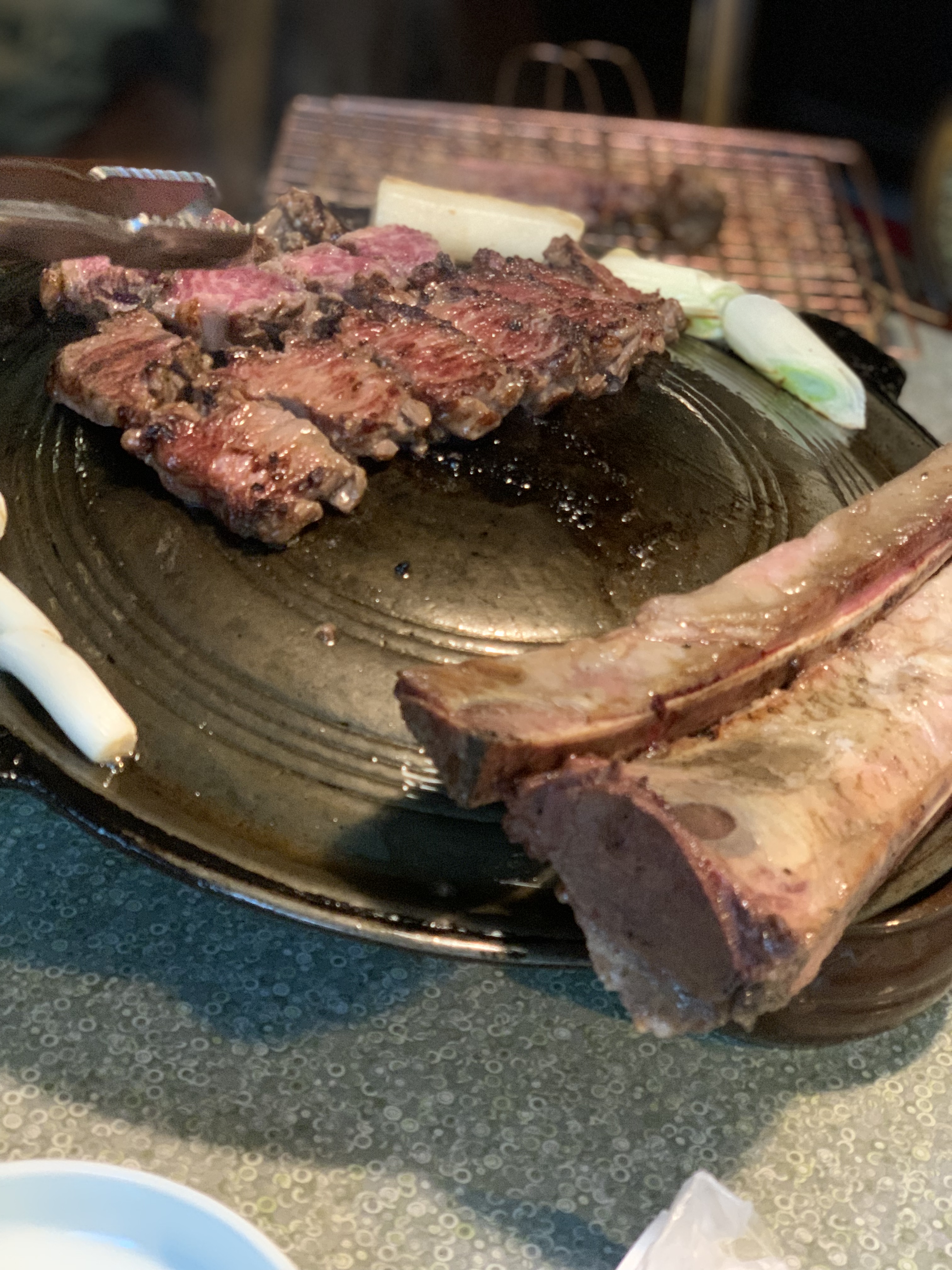 고기가 나왔고 정성껏 구워주십니다. 일단 뼈에 붙어있는 채로 나오기 때문에, 뼈에서 분리해서 가위로 잘 잘라 굽는데 조금 오래걸렸지만, 노롯노롯하니 맛있게 구워져서 먹는데 기다림이 전혀 아깝지 않았어요.