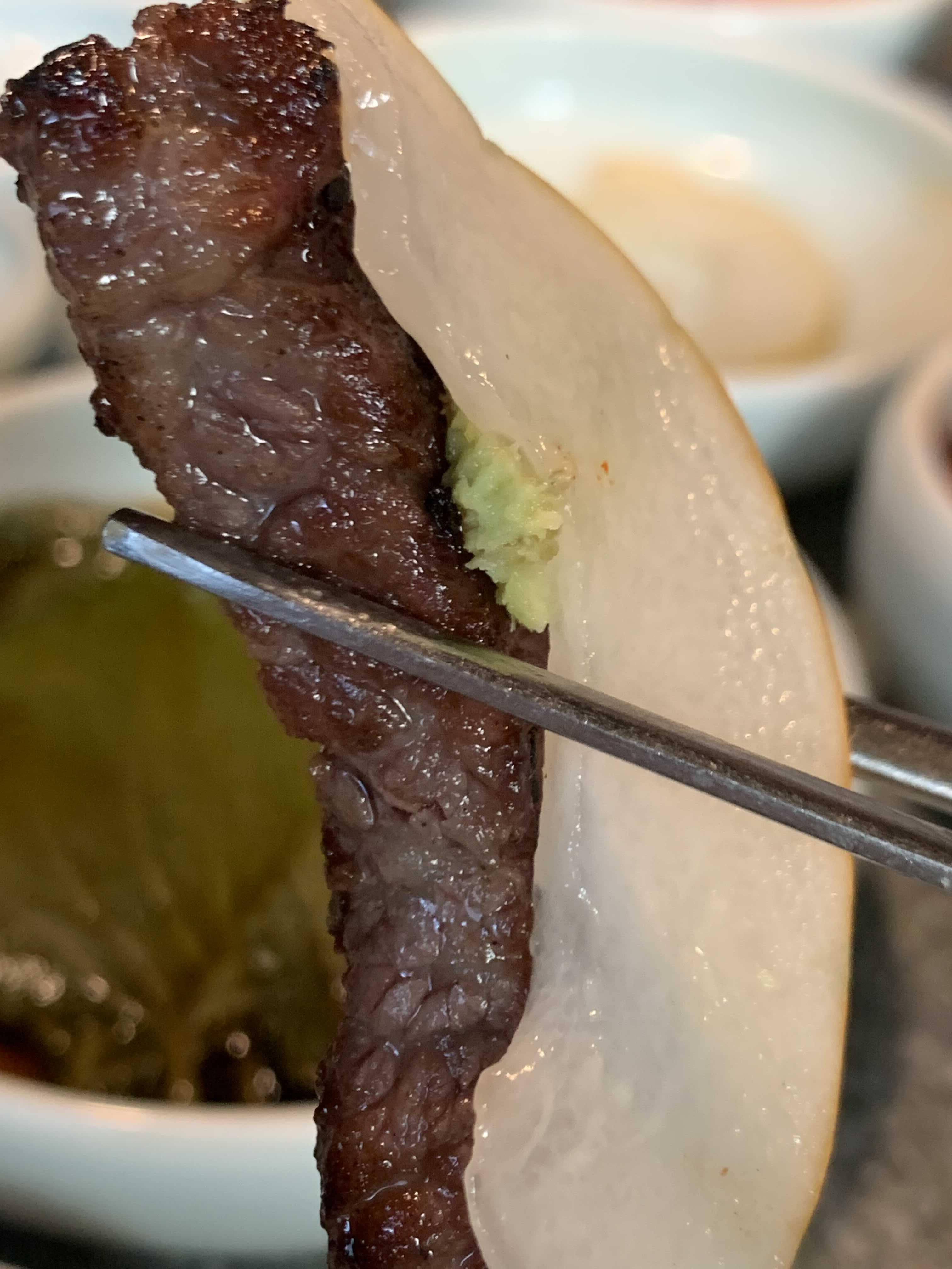 제일 최애의 궁합은 참외절임에 와사비와 고기를 함께 먹는거였는데, 와사비와 참외절임이 고기의 느끼함을 적당히 잡아줘서 조금 기름지지만 맛있게 먹을 수 있었습니다.