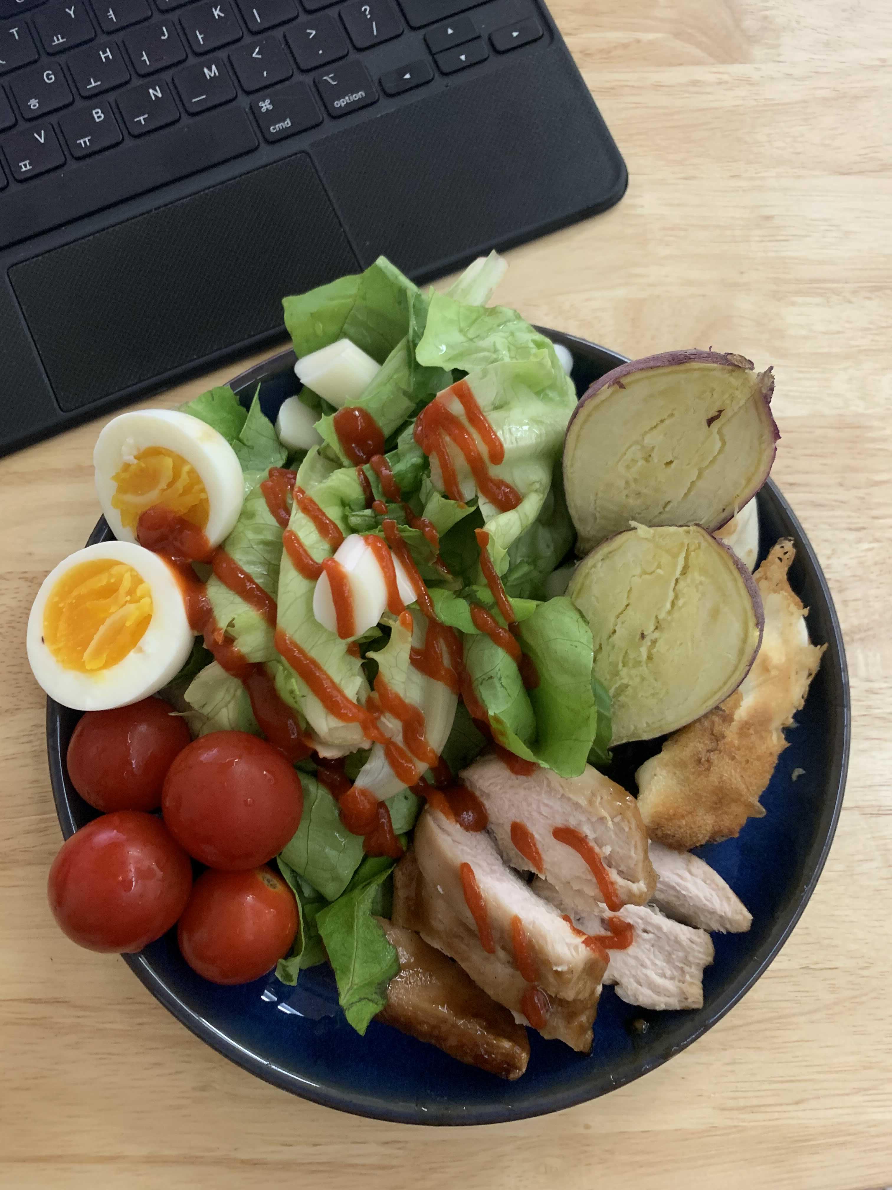 샐러드 + 방토 + 바르닭 소스먹은 닭가슴살 갈비맛 100g + 밤고구마 70g + 반숙란1 + 스리라차소스
