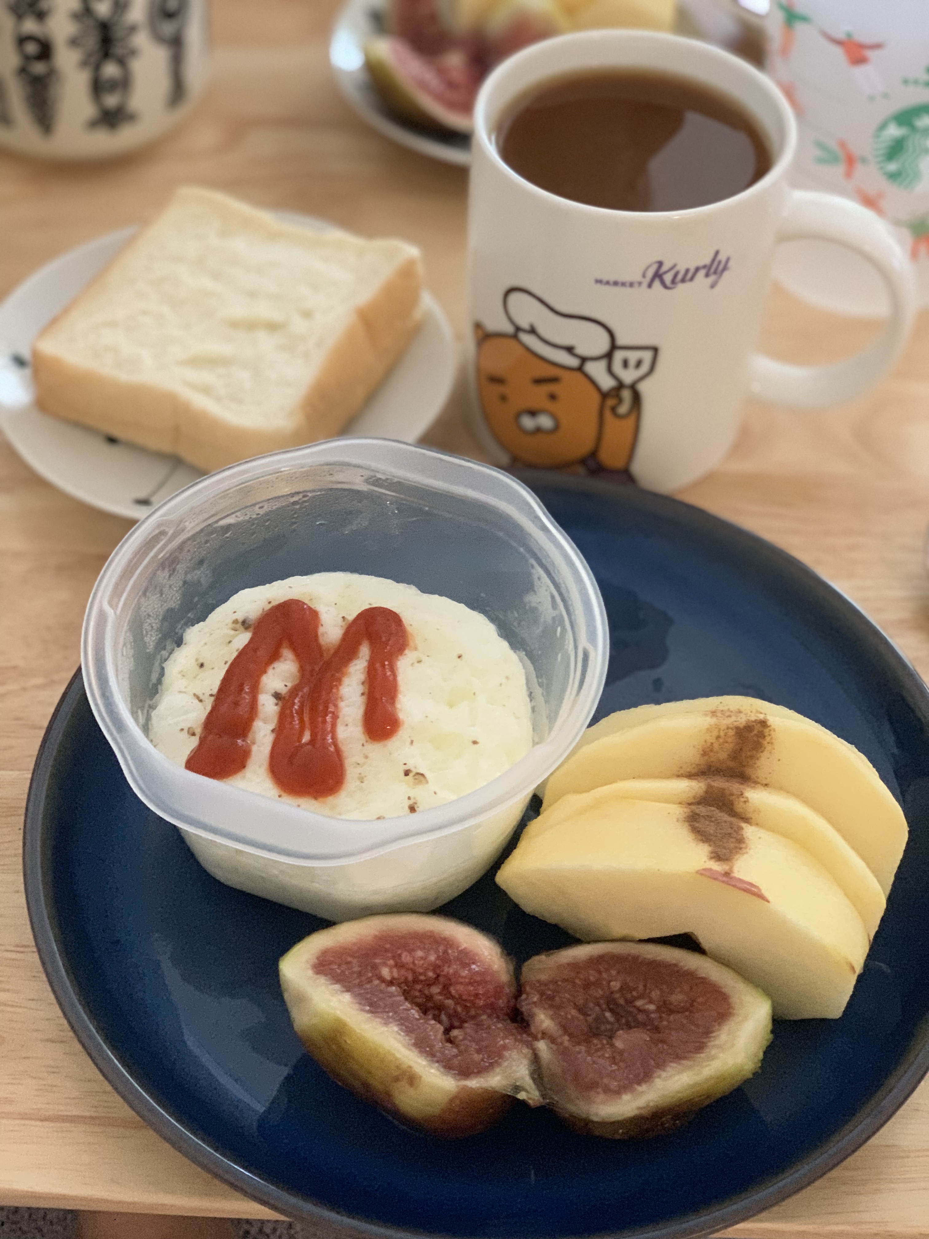 난백찜 100g + 사과1/4 + 무화과1 + 식빵에 피넛버터 + 커피