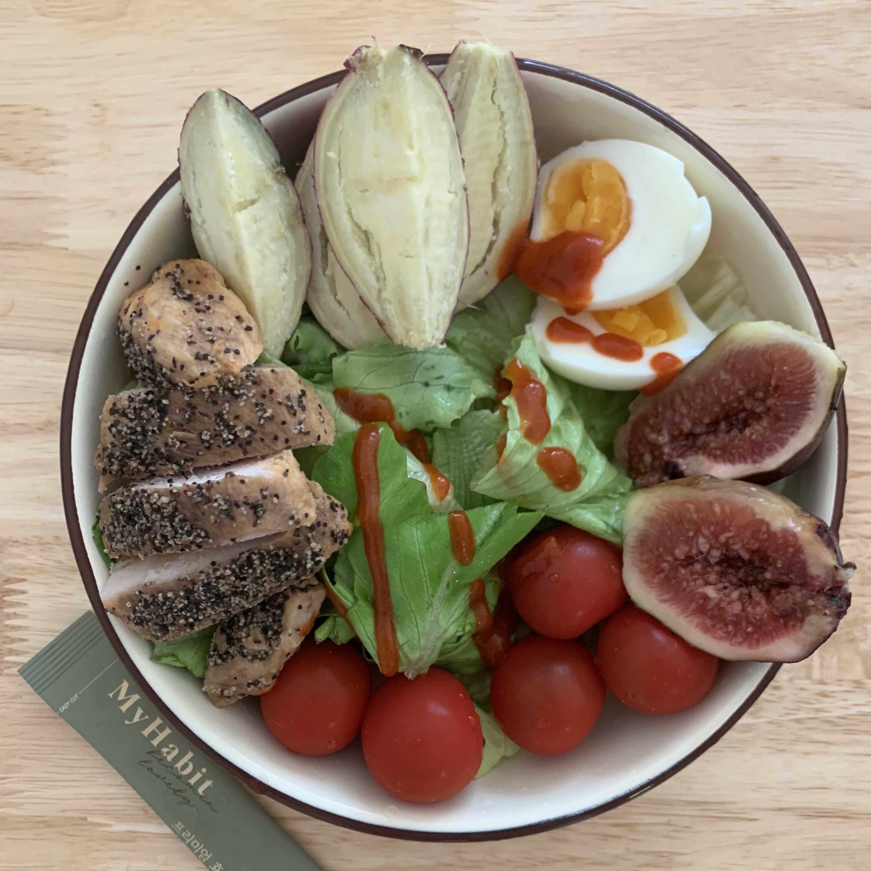 샐러드 + 방토 + 바르닭 소스먹은 닭가슴살 갈비맛 100g + 밤고구마 70g + 반숙란1 + 스리라차소스