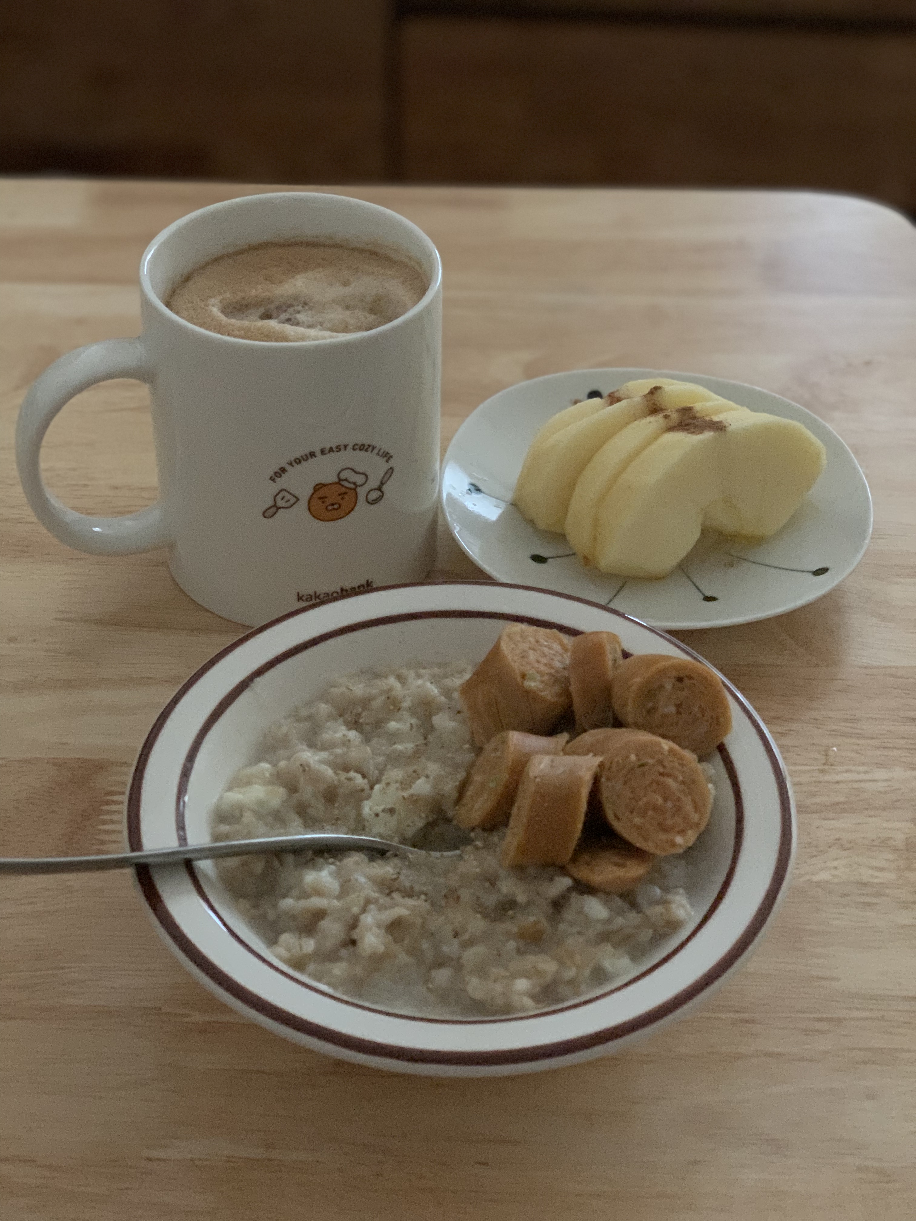오트밀죽 (오트밀 30g + 난백 30g + 물은 농도에 맞게 조절하며 전자렌지에 돌려줍니다) + 닭가슴살 소시지 1 + 사과1/4 + 커피