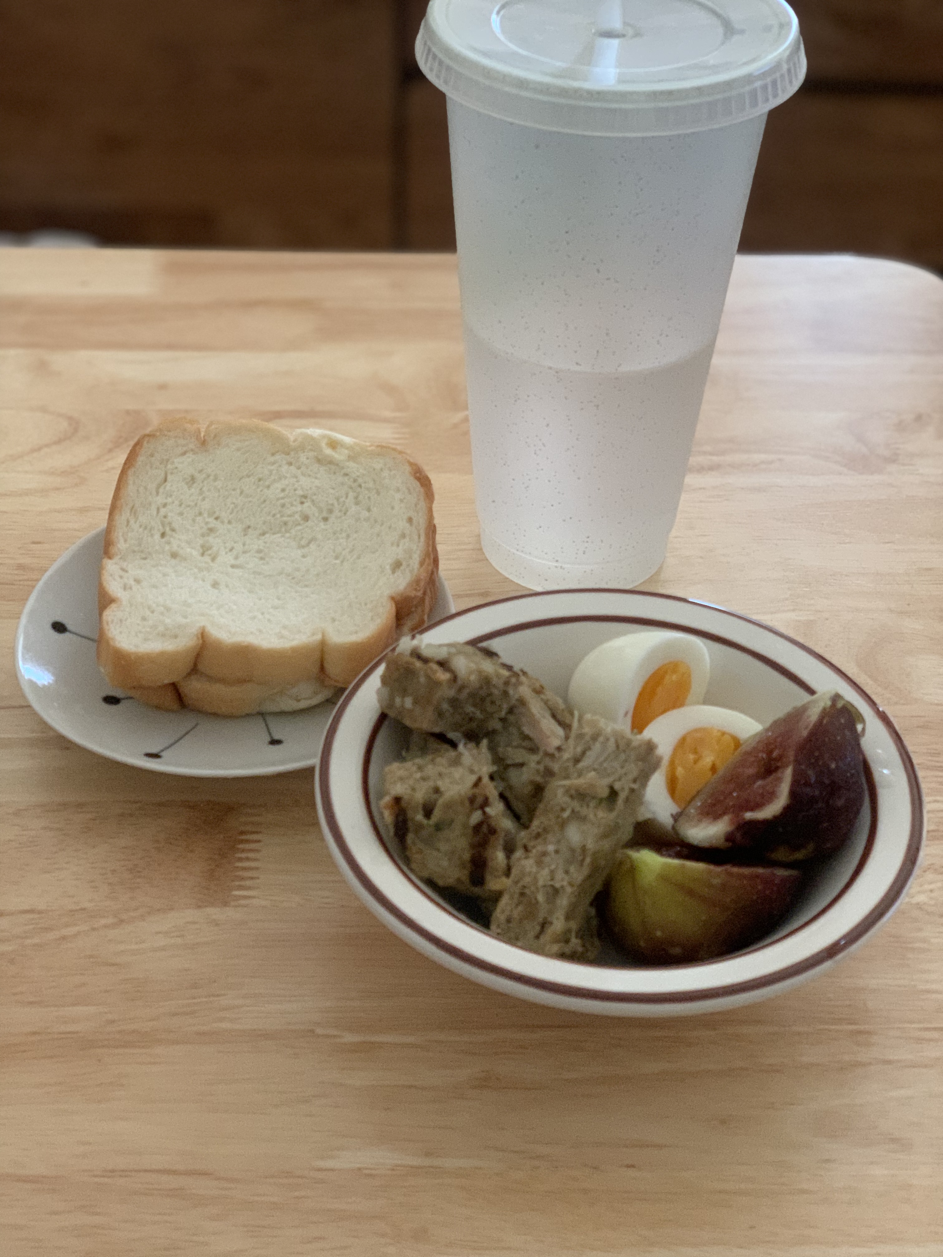 무화과1 + 반숙란1 + #바르닭 숯불 닭가슴살 떡갈비 100g + 식빵 2 에 피넛버터 + 물