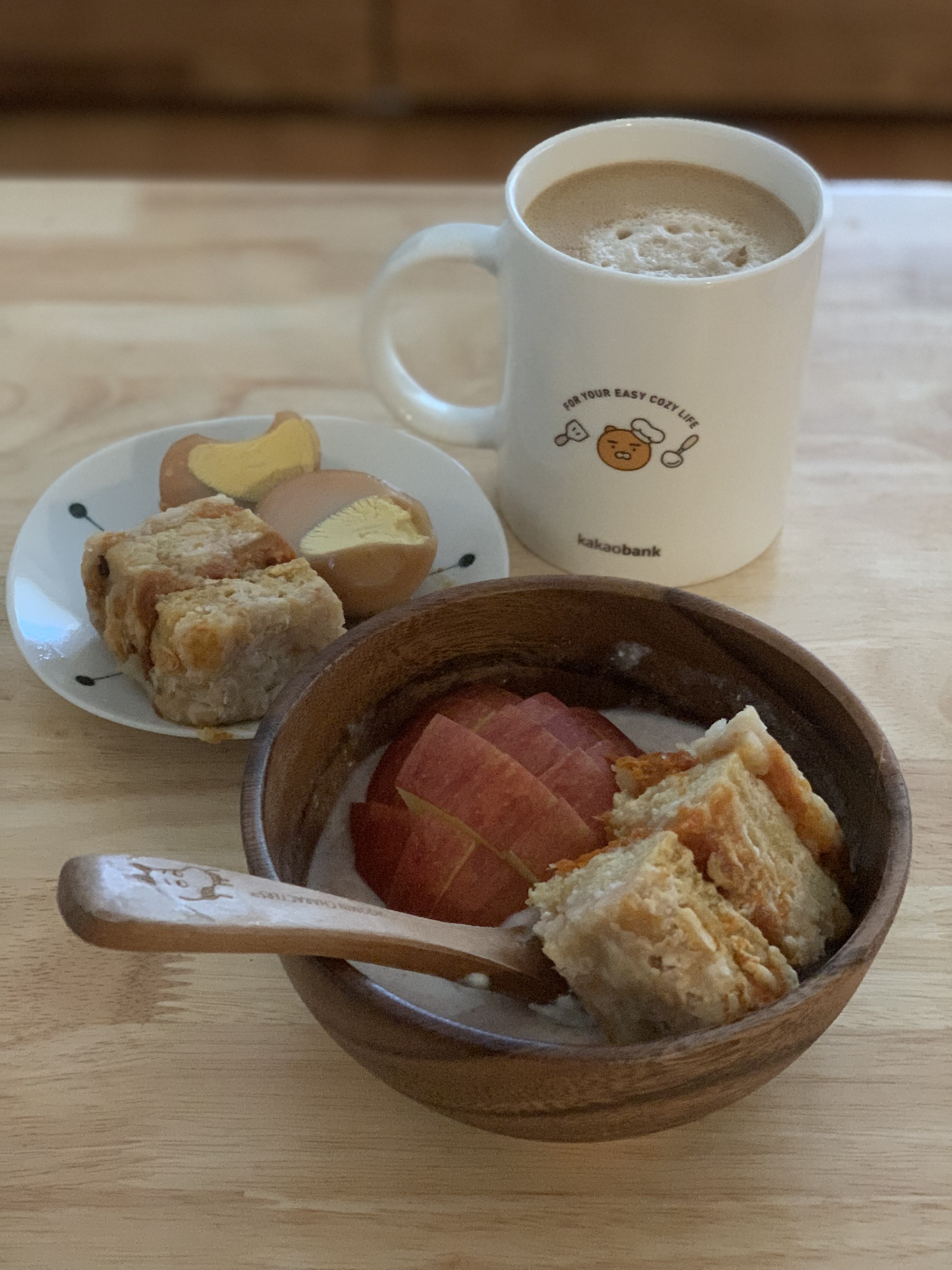 후디스 그릭요거트 80g + 아이소갓 솔티드카라멜 프로틴파우더 15g + 사과1/4 + 햇살시루 호박시루떡 1개 + 구운란1 + 커피