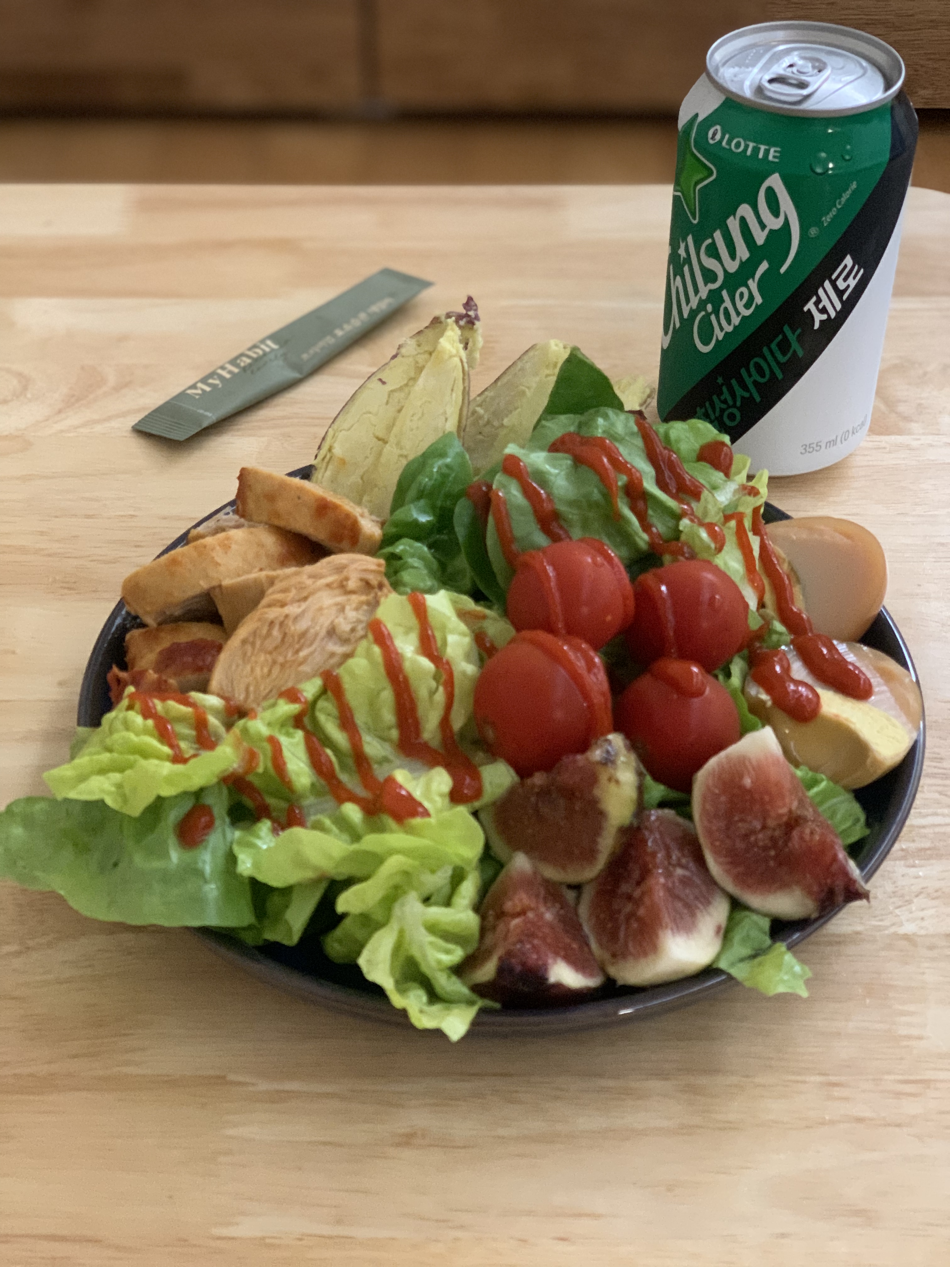 로메인 샐러드 + 방울토마토 + 구운계란 1 + 밤고구마 80g + 바르닭 수비드 닭가슴살 칠리 100g + 무화과1 + 사이다제로 + 효소