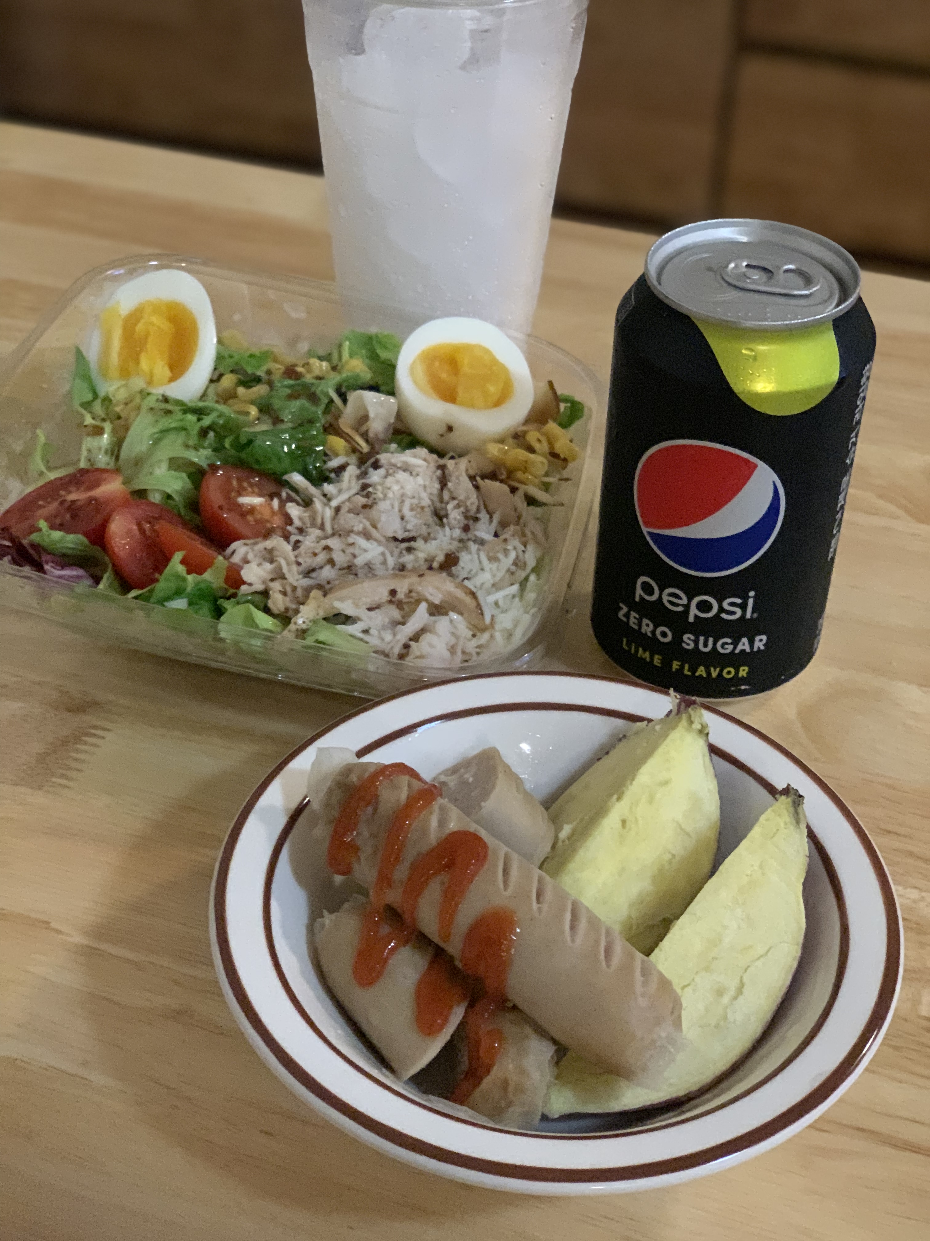 저녁은 클린하게 먹어보기로 마음먹고, 파리바게트 치킨샐러드에 반숙란1 와 갓 찐 고구마 100g, 그리고 닭가슴살 소세지, 후식으로 그릭요거트에 시나몬가루와 알룰로스를 조금섞어 아이스크림처럼 먹어주었습니다. 오늘밤 간식을 잘 참으면 클린한 저녁은 성공입니다!