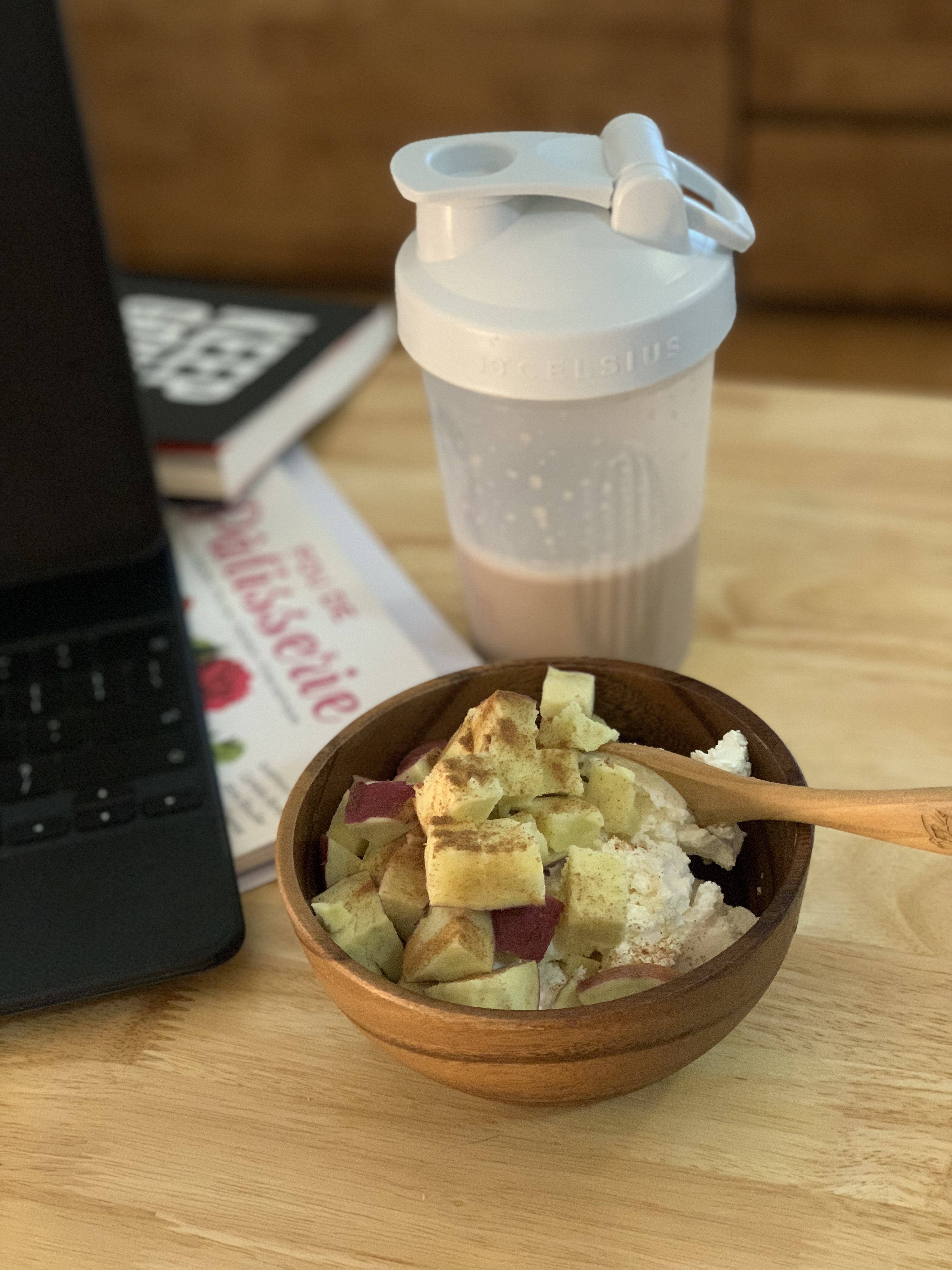 오늘의 아침은 빵이었고, 대용량 플레인 요거트가 슬슬 질리기 시작해서 프로틴파우더를 섞어서 달달한