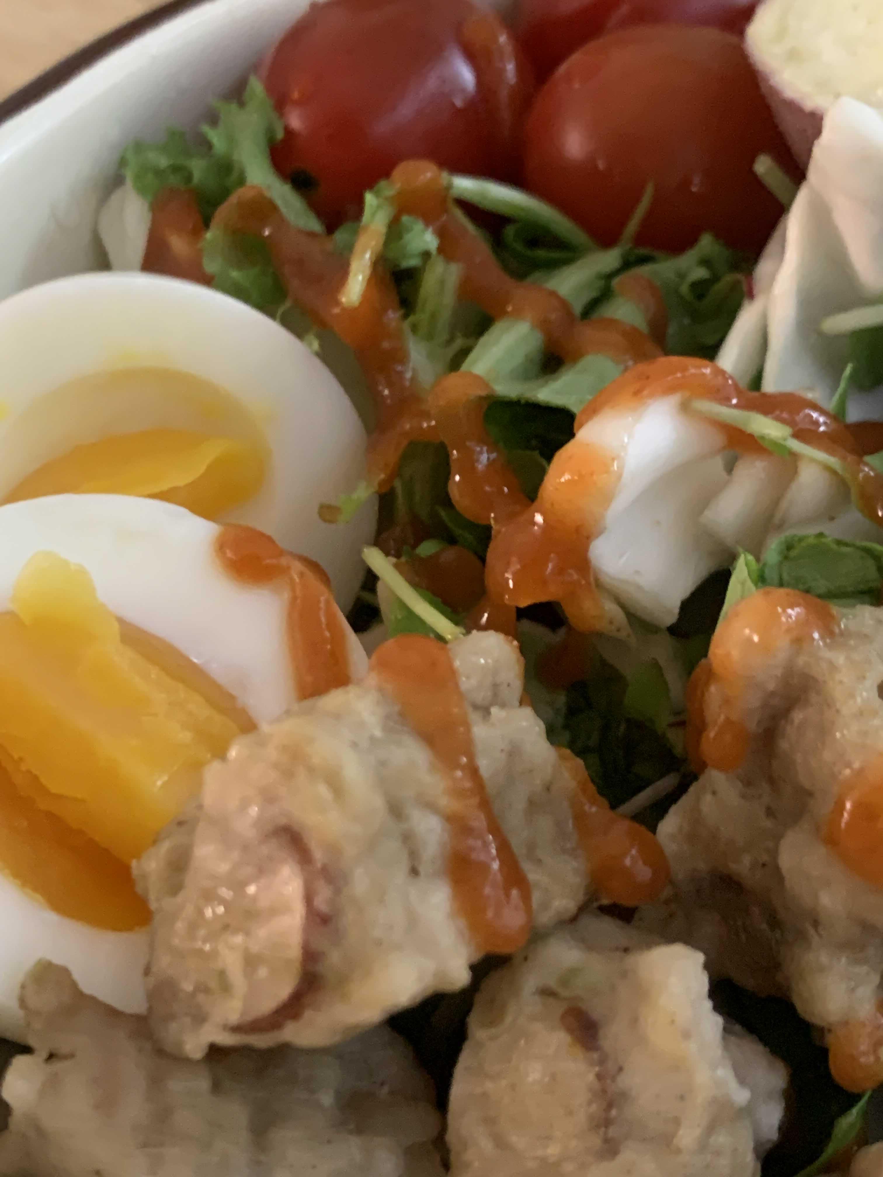 샐러드 + 토마토 + 반숙란1 + 무화과1 + 로맨틱브라운 아담하구마 80g + 바르닭 직화그릴 닭가슴살 큐브 매콤견과류 100g + 스리라차소스 + 물