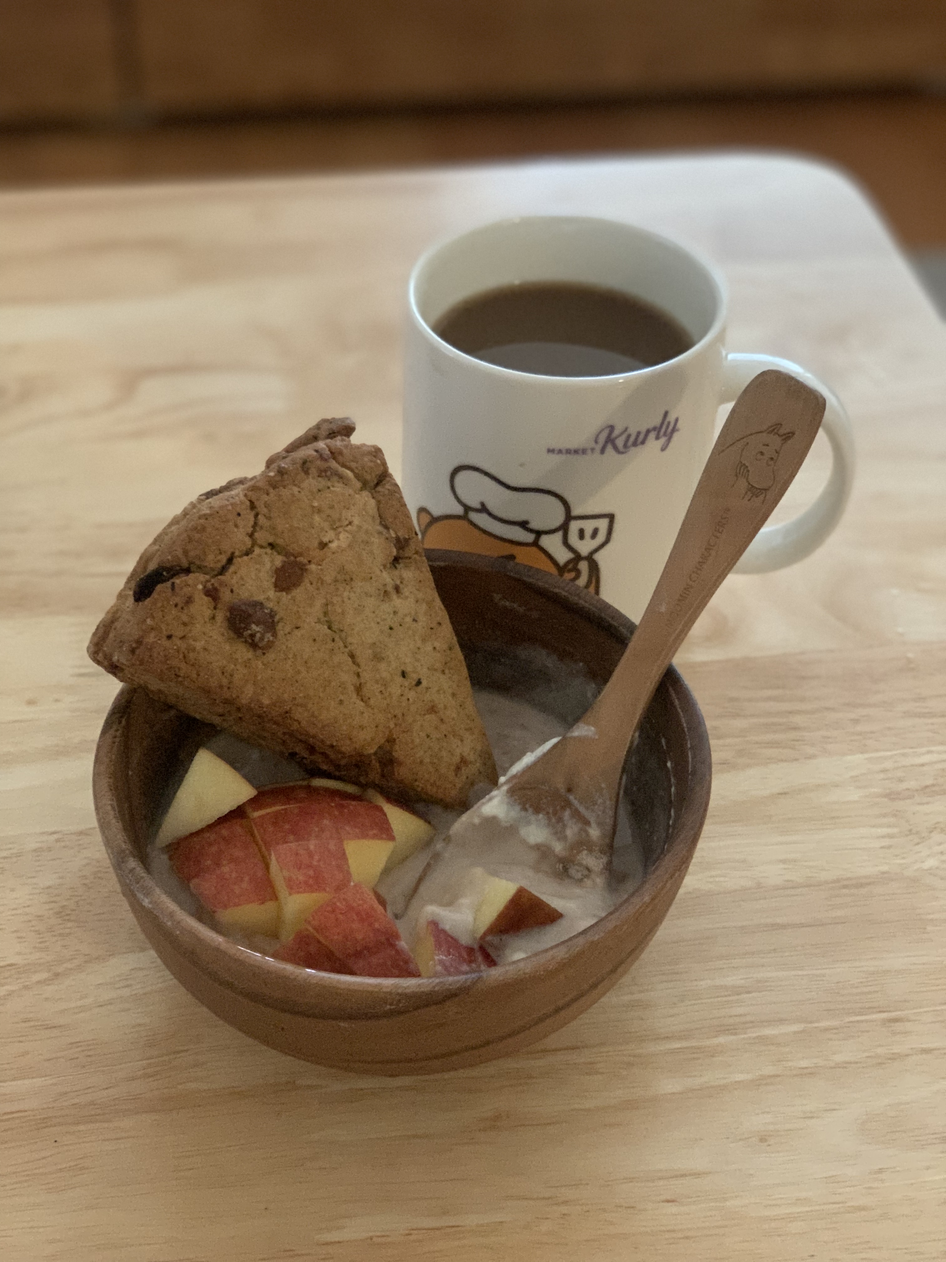 후디스 유기농 그릭요거트 80g + 프로틴파우더 15g + 사과1/4 + 머드스콘 무화과얼그레이 스콘