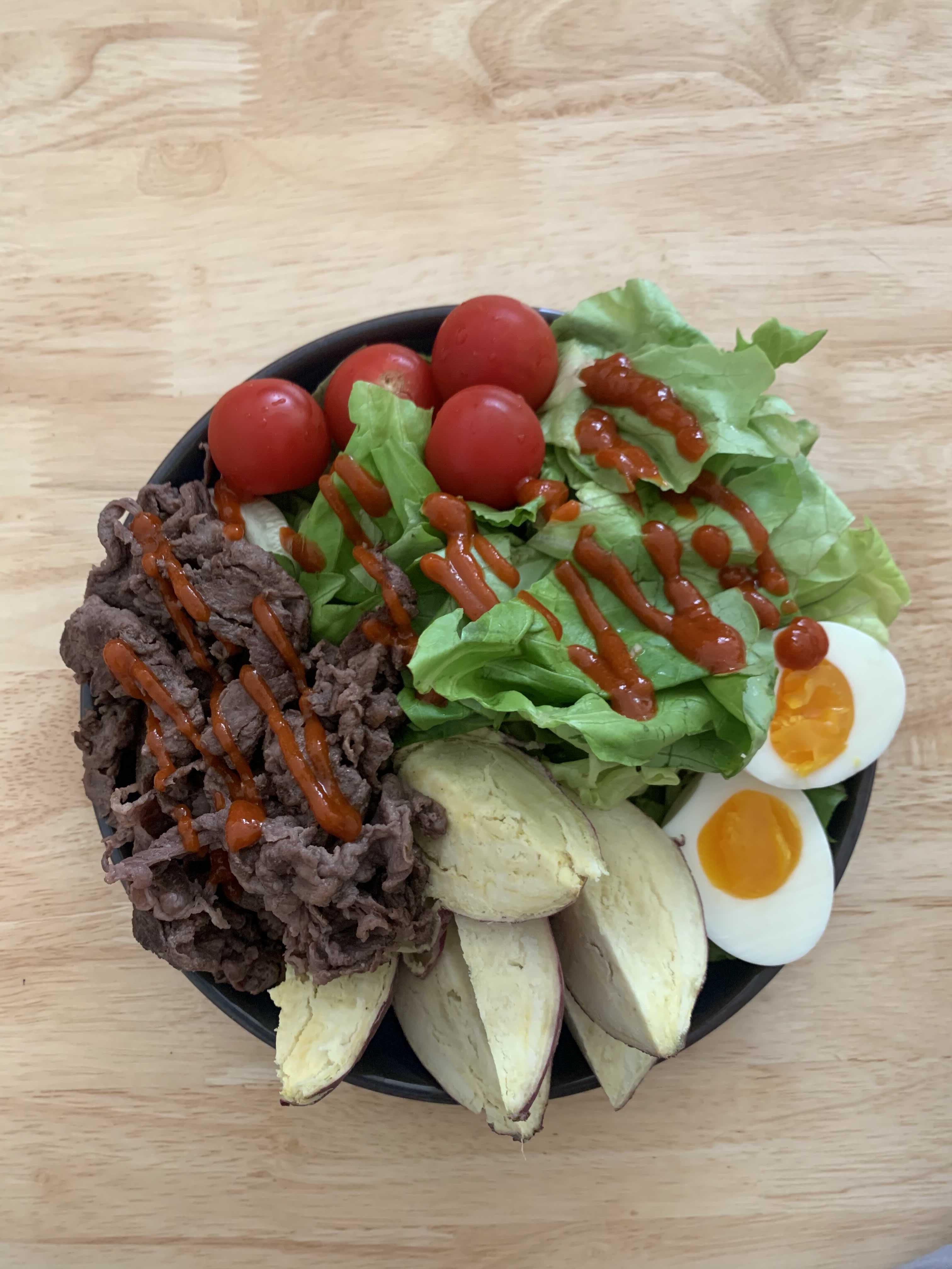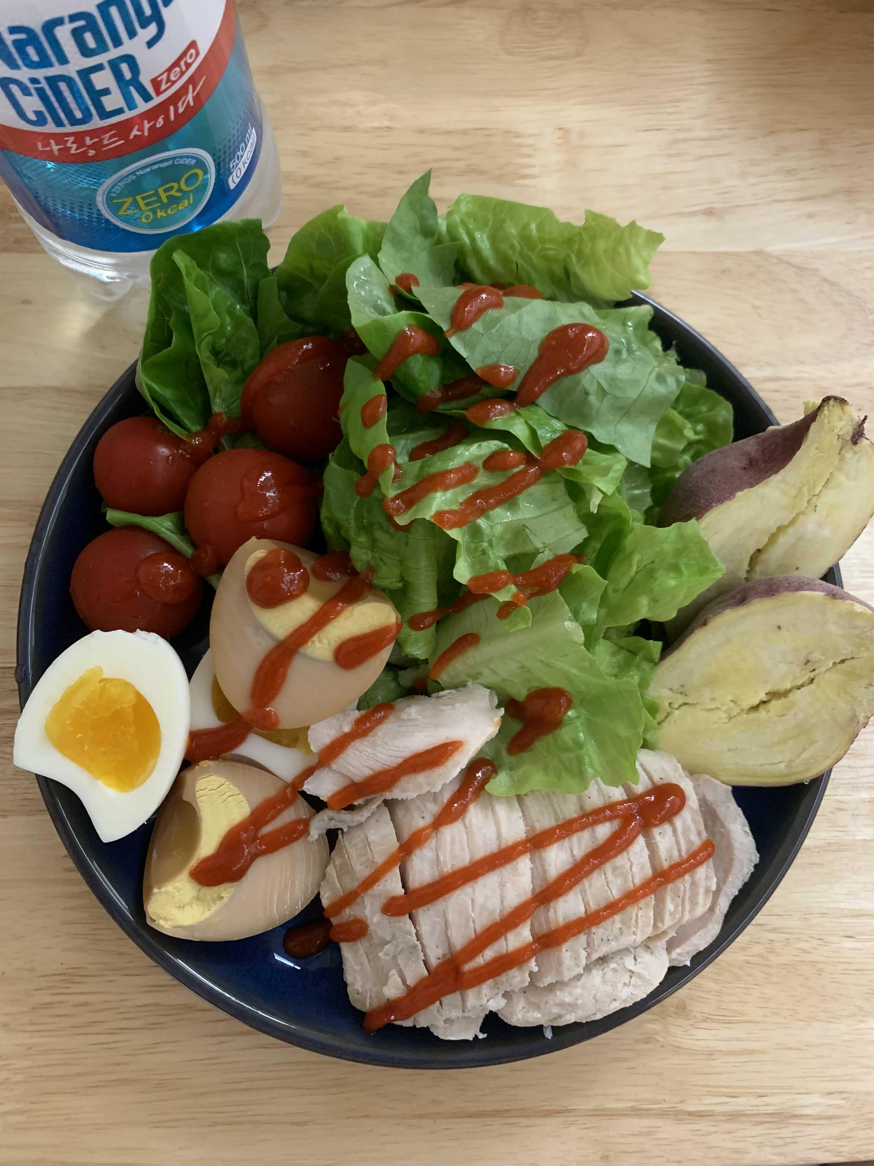 샐러드 + 방토 + 소고기 우둔살 110g + 밤고구마 150g + 반숙란1 + 스리라차소스