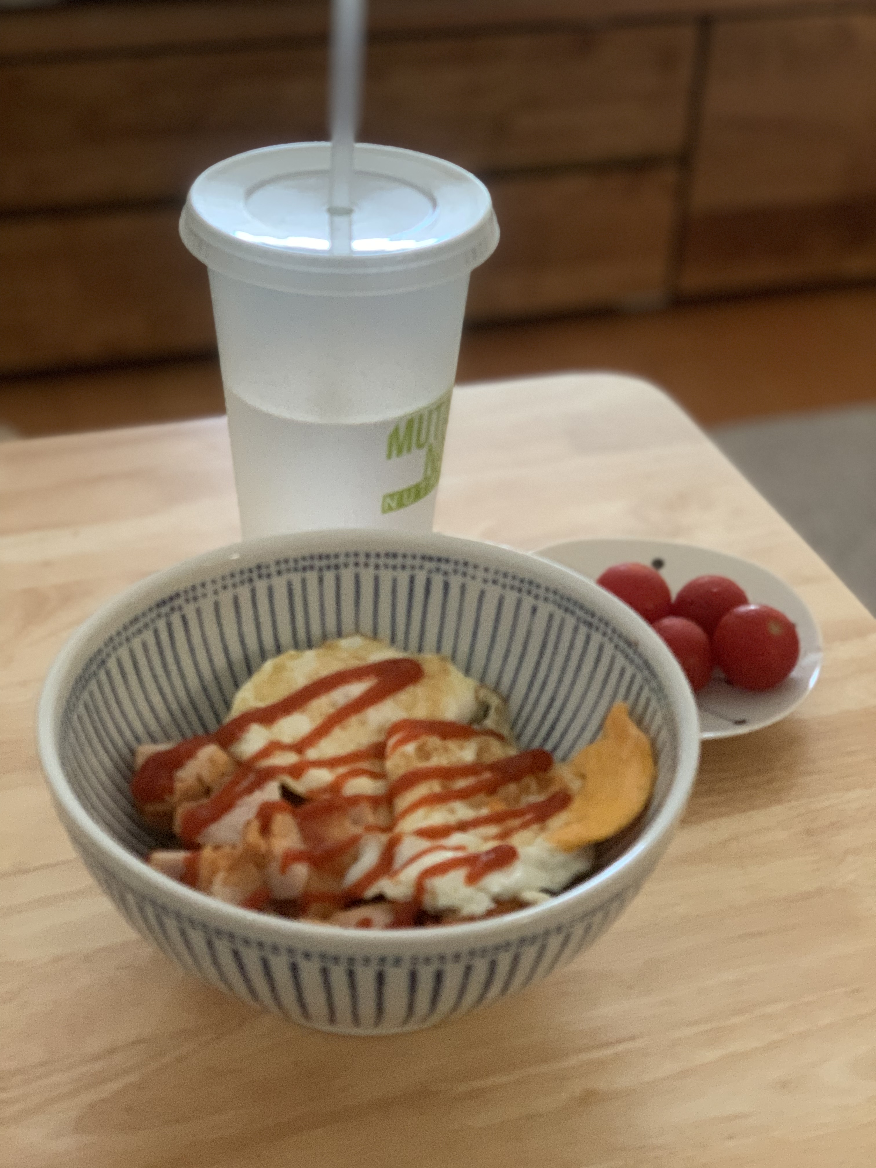 현미밥 120g + 달걀후라이 2 + #바르닭 수비드 닭가슴살 칠리 100g + 무말랭이 조금 + 스리라차소스
