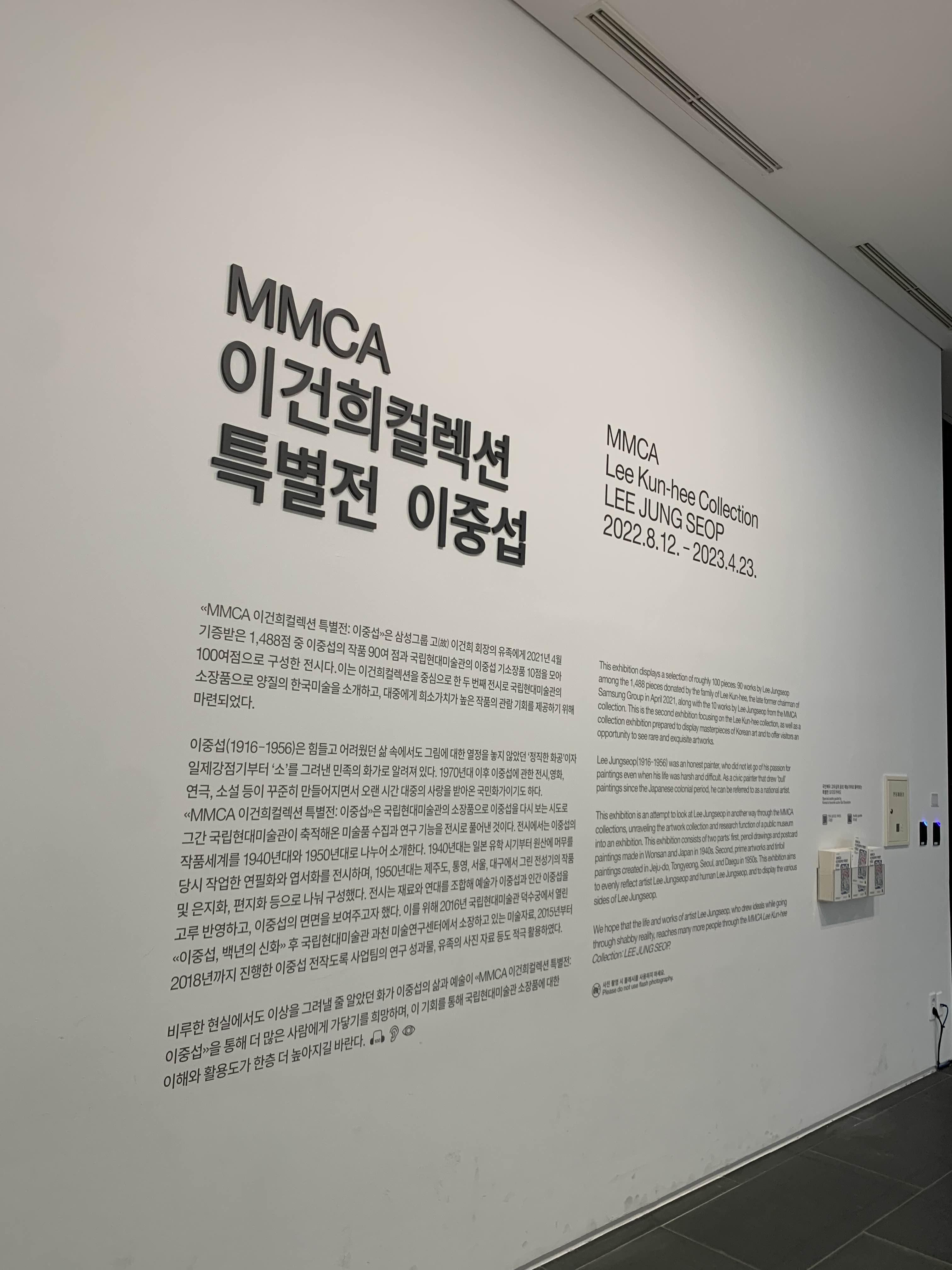 <<MMCA 이건희컬렉션 특별전: 이중섭>>은 삼성그룹 고(故) 이건희 회장의 유족에게 2021년 4월 기증받은 1,488점 중 이중섭의 작품 90여 점과 국립현대미술관의 이중섭 기소장품 10점을 모아 100여 점으로 구성한 전시입니다. 이는 이건희컬렉션을 중심으로 한 두 번째 전시로 국립현대미술관의 소장품으로 양질의 한국미술을 소개하고, 대중에게 희소가치가 높은 작품의 관람 기회를 제공하기 위해 마련되었다고 합니다.
