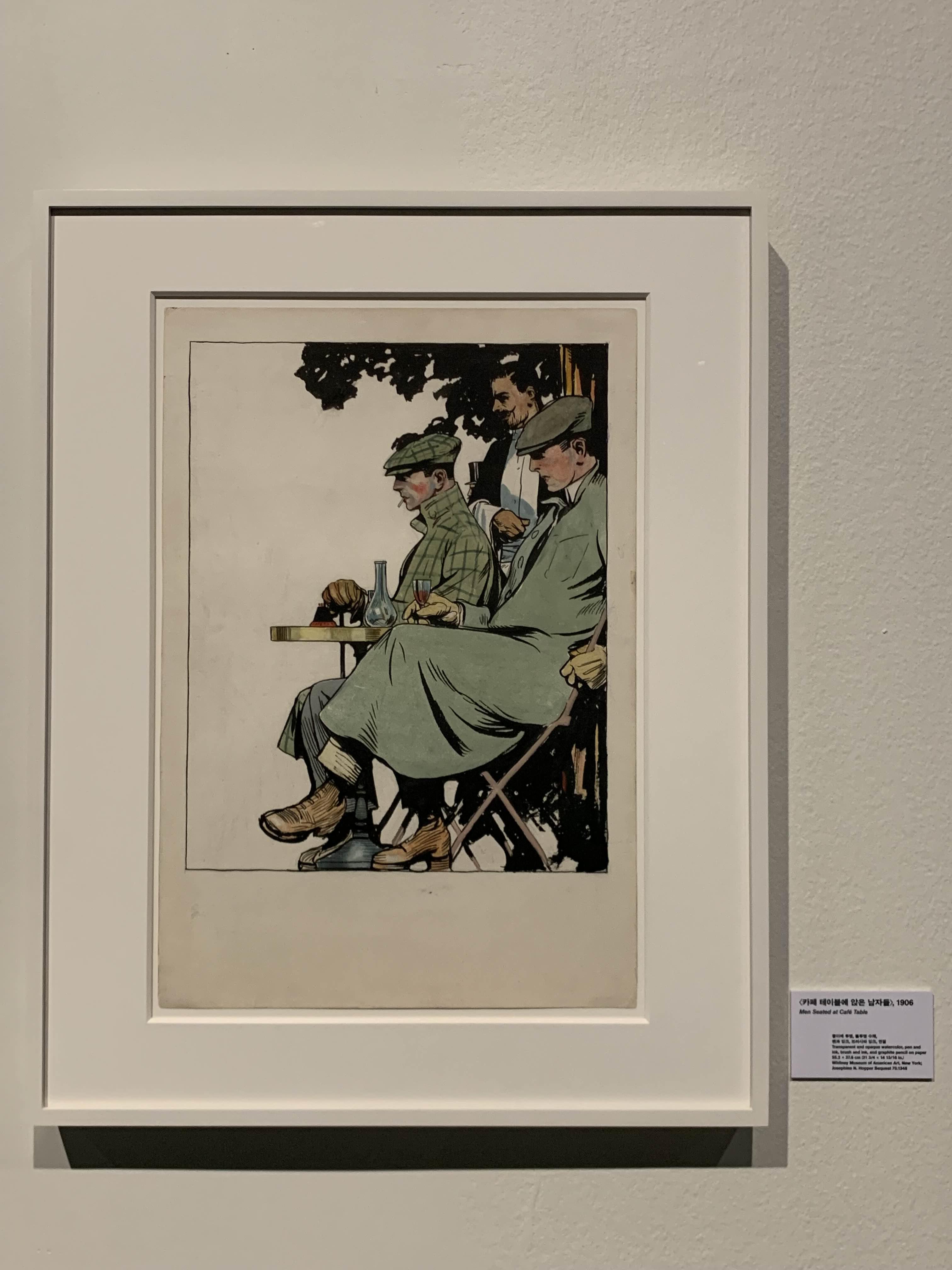 제일 기억에 남는 작품은 3층 전시관 '파리' 섹션에 있는 '푸른 저녁(1914)'였습니다. 가로로 긴 캔버스에 인물 하나하나에 디테일이 살아있는 작품이었습니다. 뉴욕에서 완성되었다고 하는 이 작품은, 실제적인 관찰에 기초한 구성에서 출발하되 기억과 상상력이 더해져 완성된 호퍼의 리얼리즘적인 특성이 강하게 나타났습니다. 그가 마지막 파리 방문 이후 4년이 지나 뉴욕에서 그린 이 작업은 인물들의 단절적 관계와 심리적 풍경 묘사라는 그의 성숙기 회화의 속성을 드러낸다는 점에서도 주목할 필요가 있습니다.