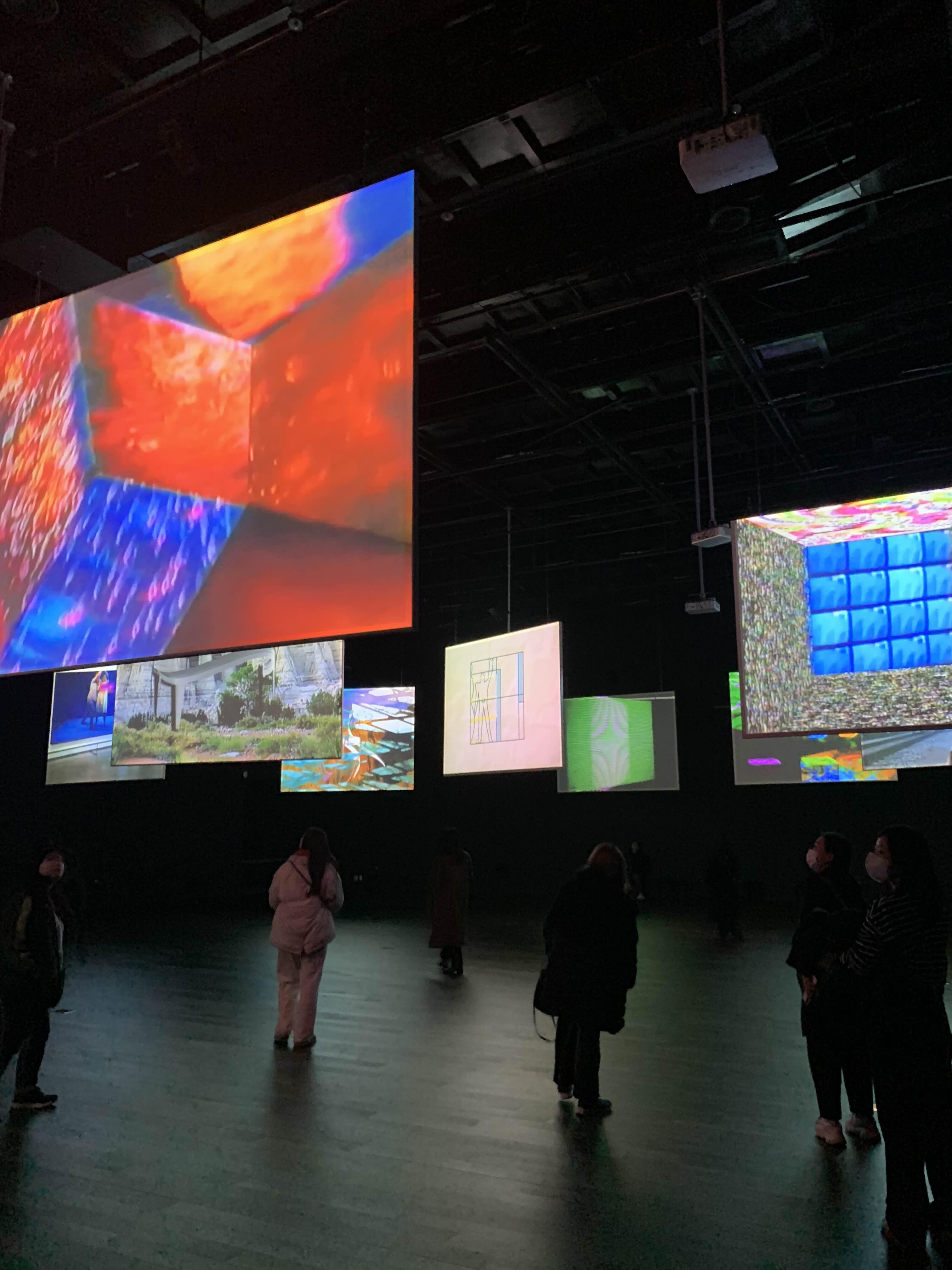대부분의 전시된 작품들이 영상물이어서 하나하나 처음부터 끝까지 관람은 하지 못했지만, 자주 접해보지 못한 종류의 전시라 그런지 호기심 있게 전시를 즐길 수 있었던 것 같습니다. 그 중 제일 인상깊었던 작품은, 커다란 공간에 수십개의 화면들을 천장에 매달아 두었는데, 각 각의 화면에서 각기 다른 영상을 보여주고 있었습니다. 영상 중에는 좀 충격적인 장면도 있었기도 했지만, 공간 자체를 하나의 작품으로 보기 시작하니 색색이 화려하고 정신없이 지나가는 장면들 모두 그 공간을 충분히 즐길 수 있는 요소가 되었던 것 같습니다.