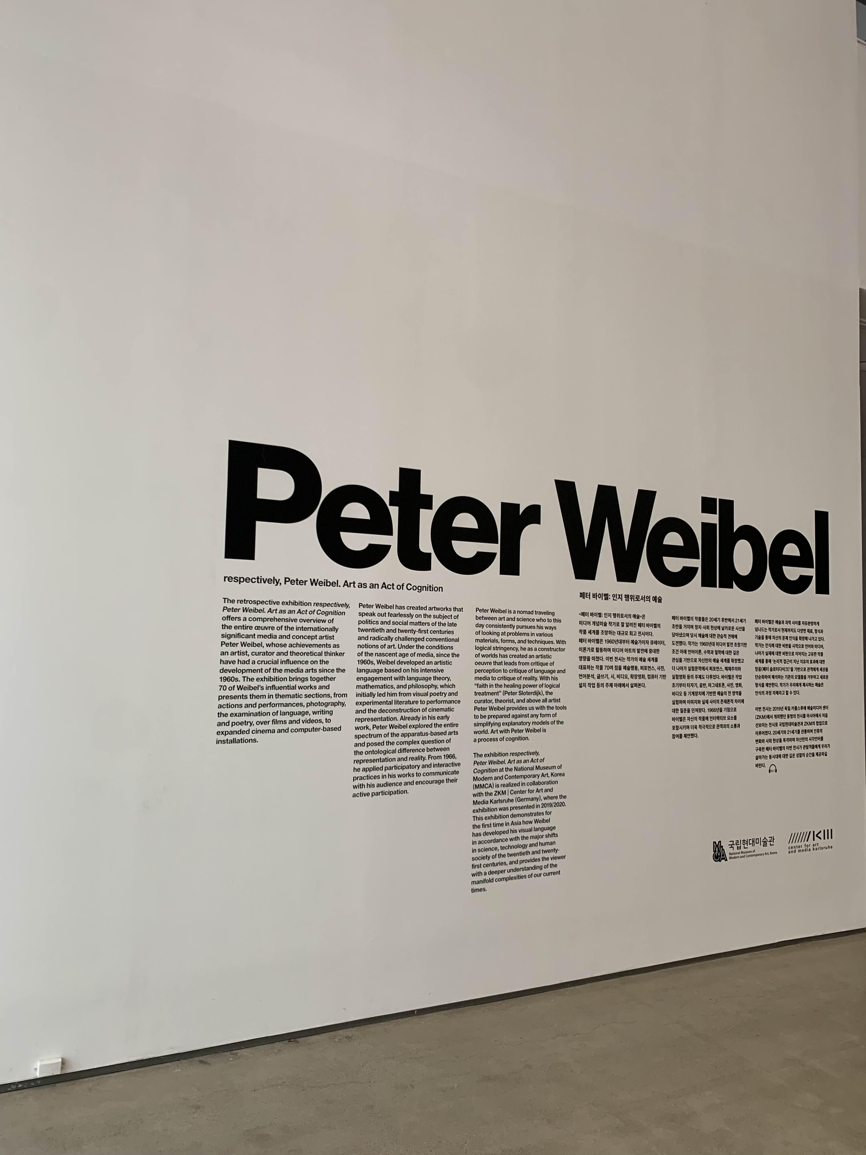 <<페터 바이벨: 인지 행위로서의 예술>>은 미디어 개념미술 작가로 잘 알려진 페터 바이벨의 작품 세계를 조망하는 대규모 회고 전시입니다. 페터 바이벨은 1960년대부터 예술가이자 큐레이터, 이론가로 활동하며 미디어 아트의 발전에 중대한 영향을 미쳤습니다. 이번 전시는 작가의 예술 세계를 대표하는 작품 70여점을 예술행동, 퍼포먼스, 사진, 언어분석, 글쓰기, 시, 비디오, 확장영화, 컴퓨터 기반 설치 작업 등의 주제 아래에서 살펴보았습니다.