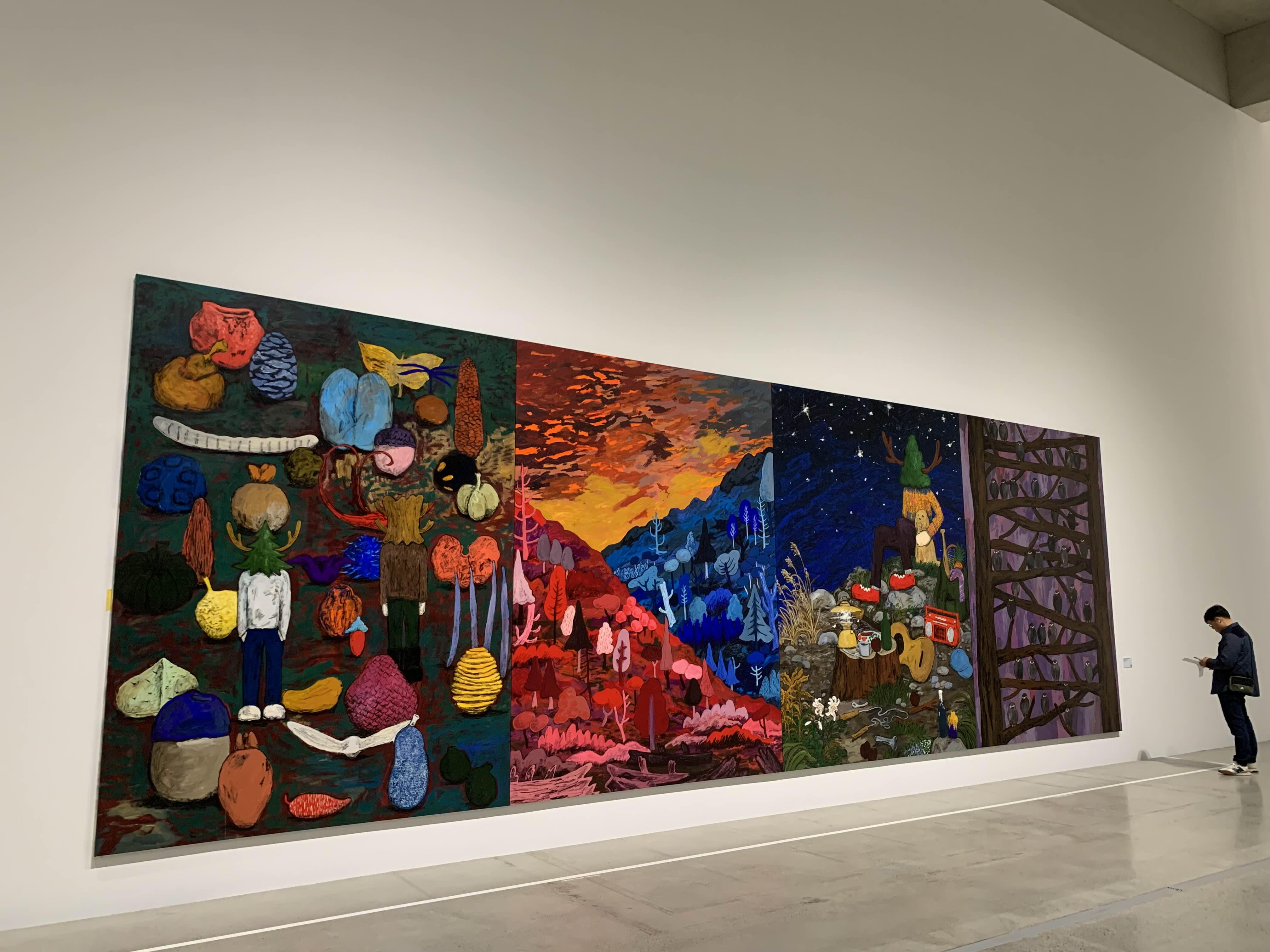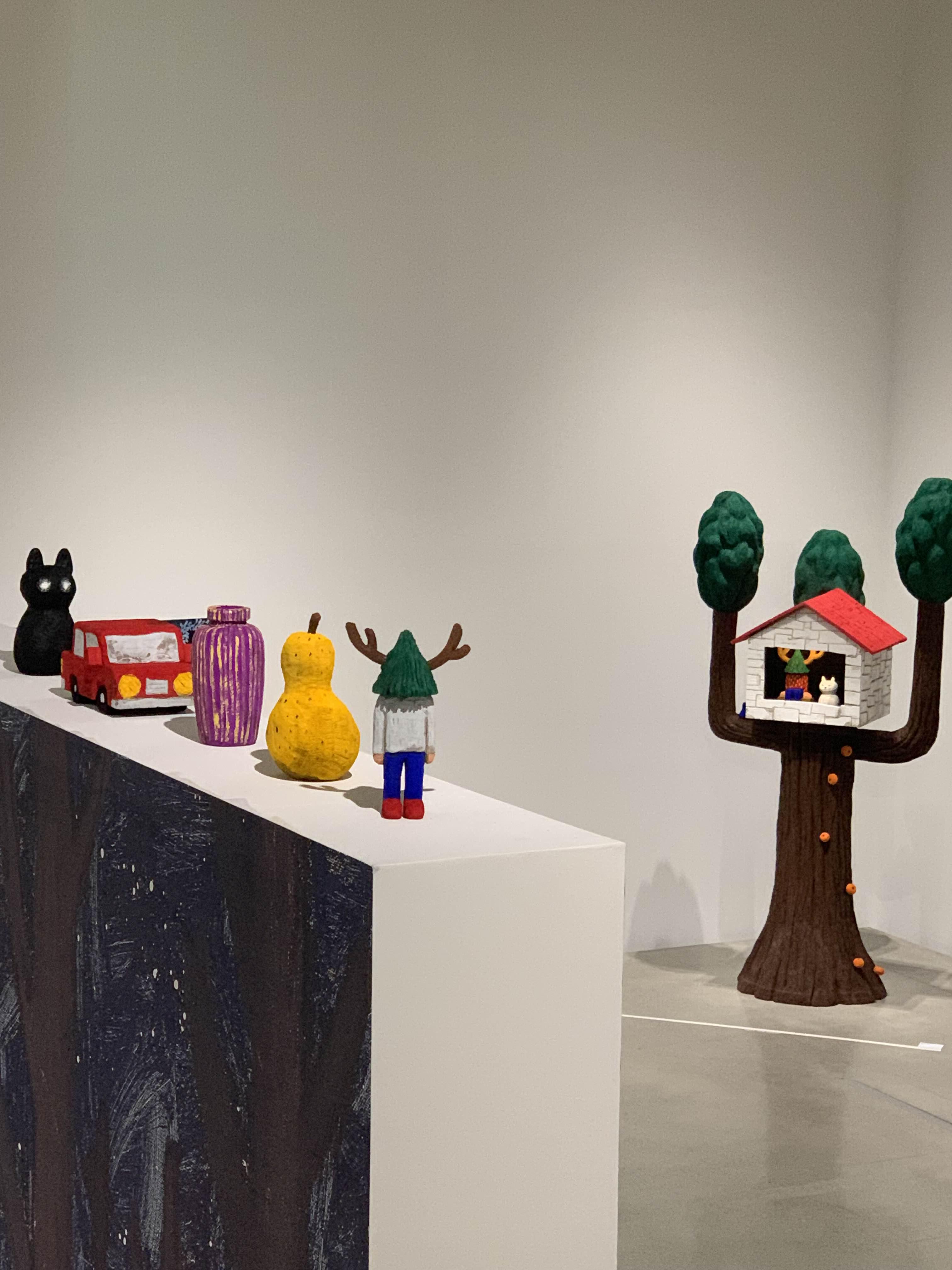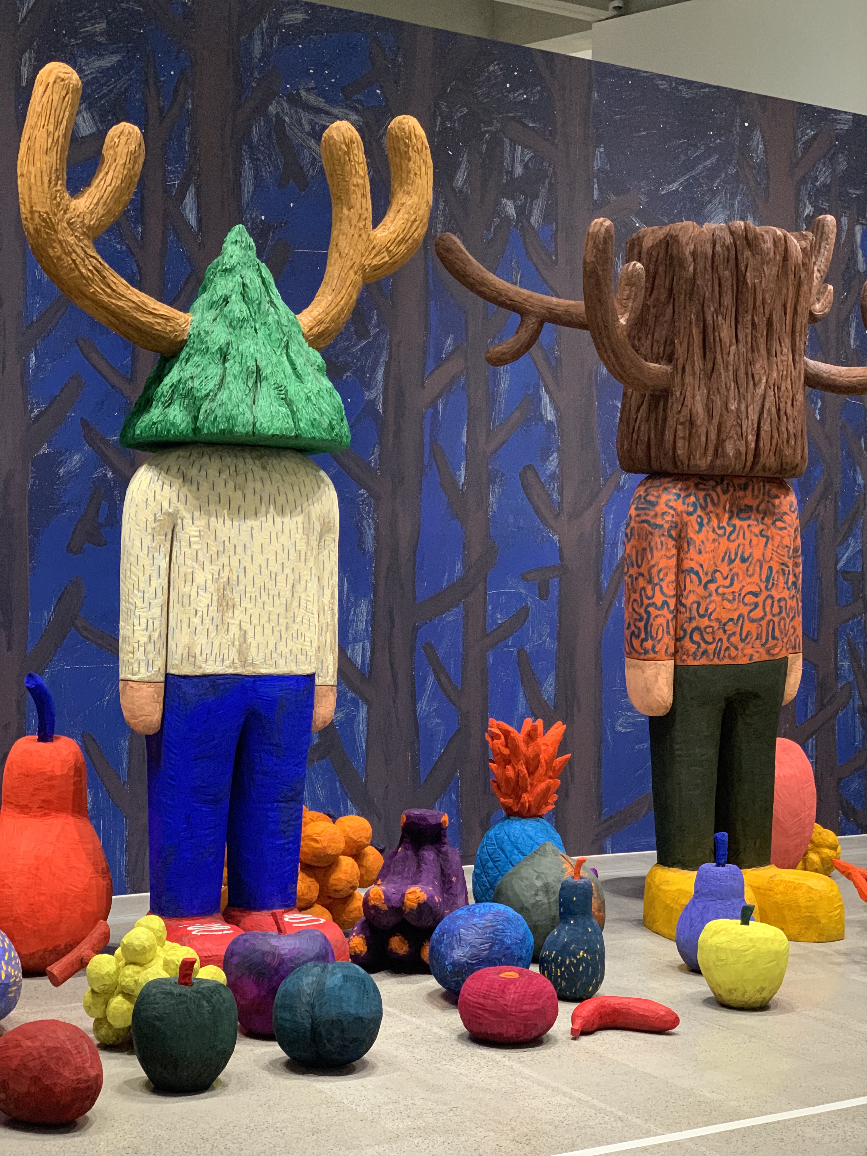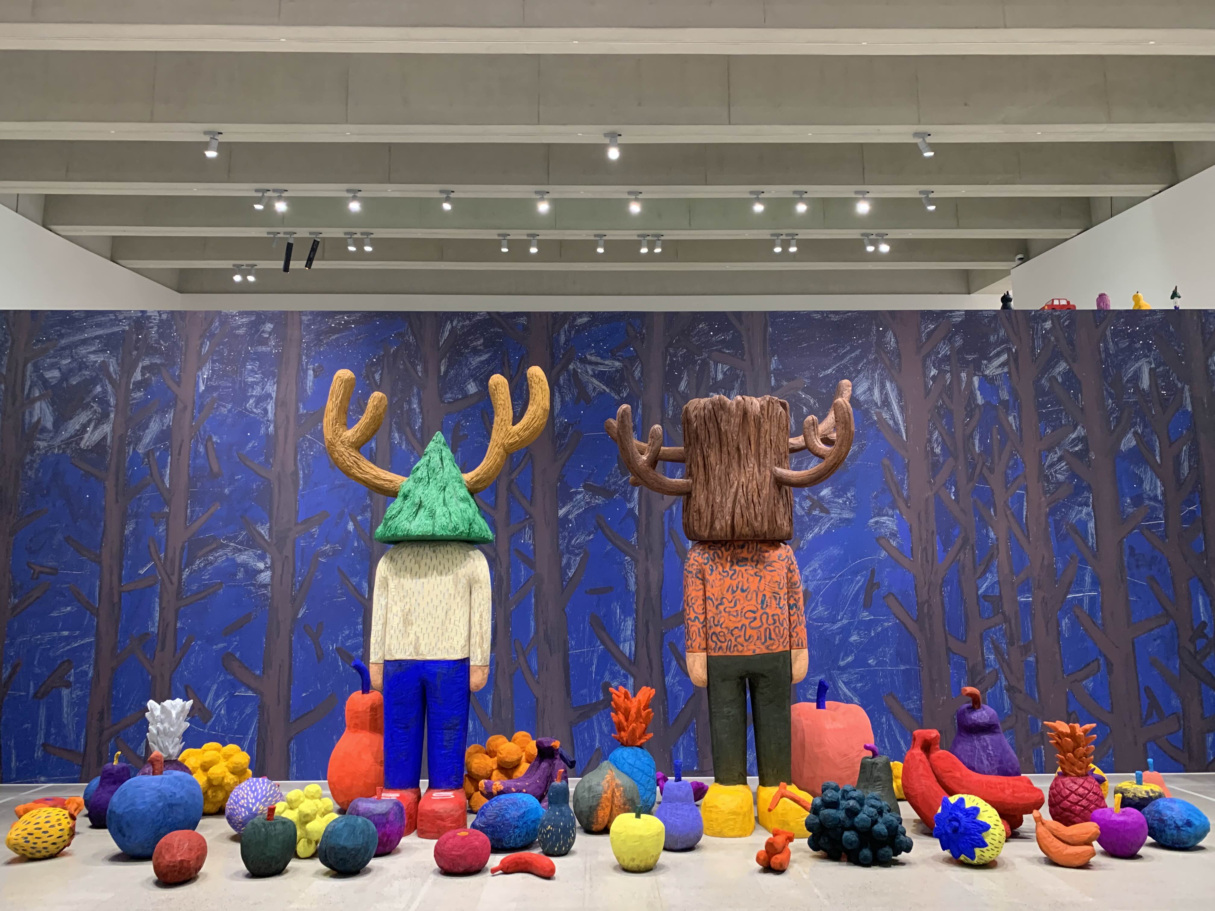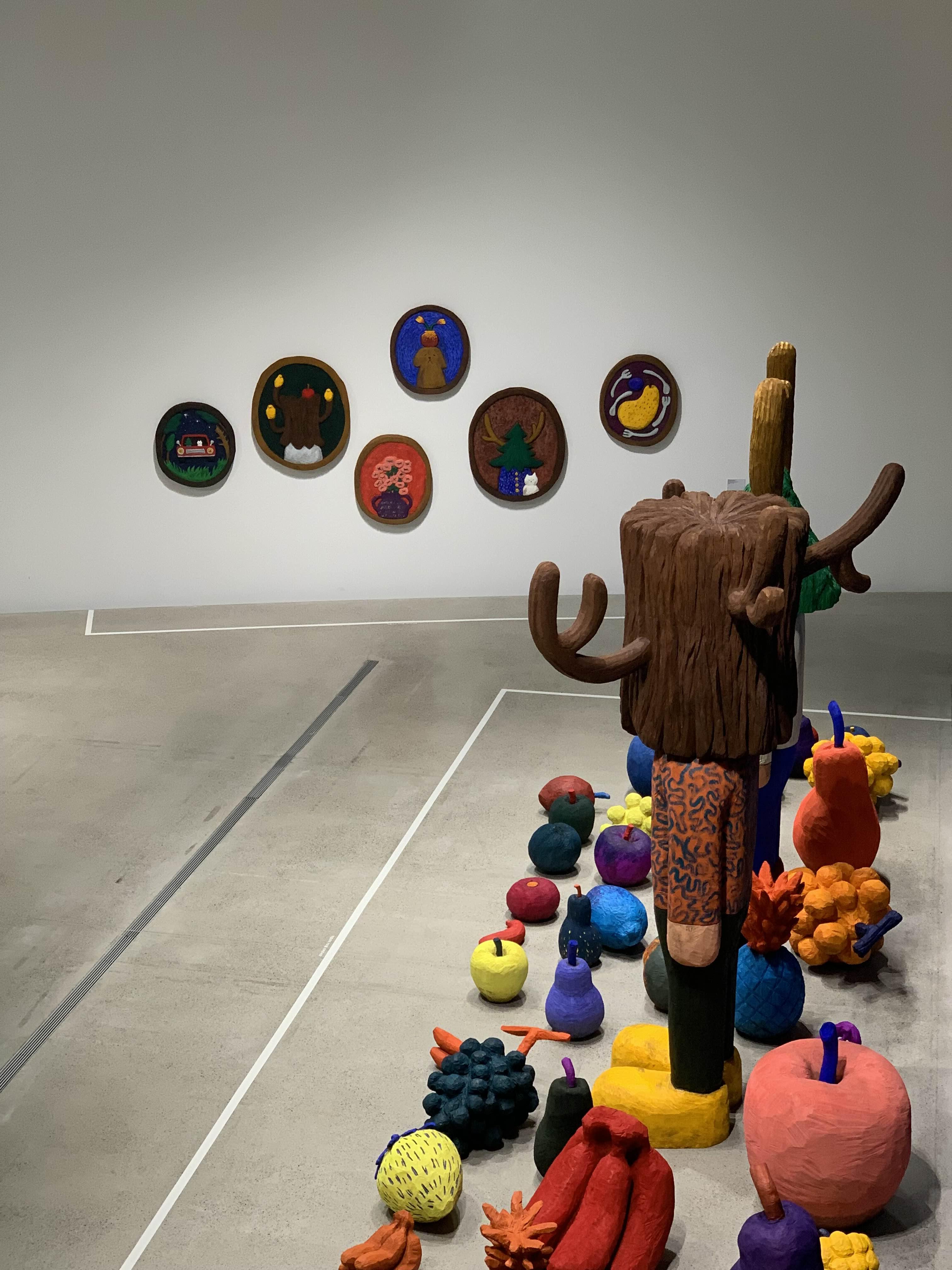 또한, 전시장 중간 눈길을 사로잡는 작품 <Wooden Wood 49, 2023>은 다양한 식물들의 열매가 작가의 캐릭터와 함께 설치가 되어있습니다. 3m가 넢는 거대한 혼종의 인물들은 나무 조각으로 제작이 되어 그 질감이 두드러 집니다. 원색이 강조되는 열매들 또한 캐릭터 주변으로 배치되어 마치 그들이 수집한 것과 같은 상황을 연출하게 됩니다. 입체로 등장하는 작가의 캐릭터들은 이제 평면을 벗어나 현실과의 간극을 줄이고 자신의 작품이 먼 세상의 이야기로만 느껴지지 않도록 조각을 제작했다고 합니다. 차원을 넘나들었을 때 관객이 느끼는 대상의 감각을 실험하는 것입니다.