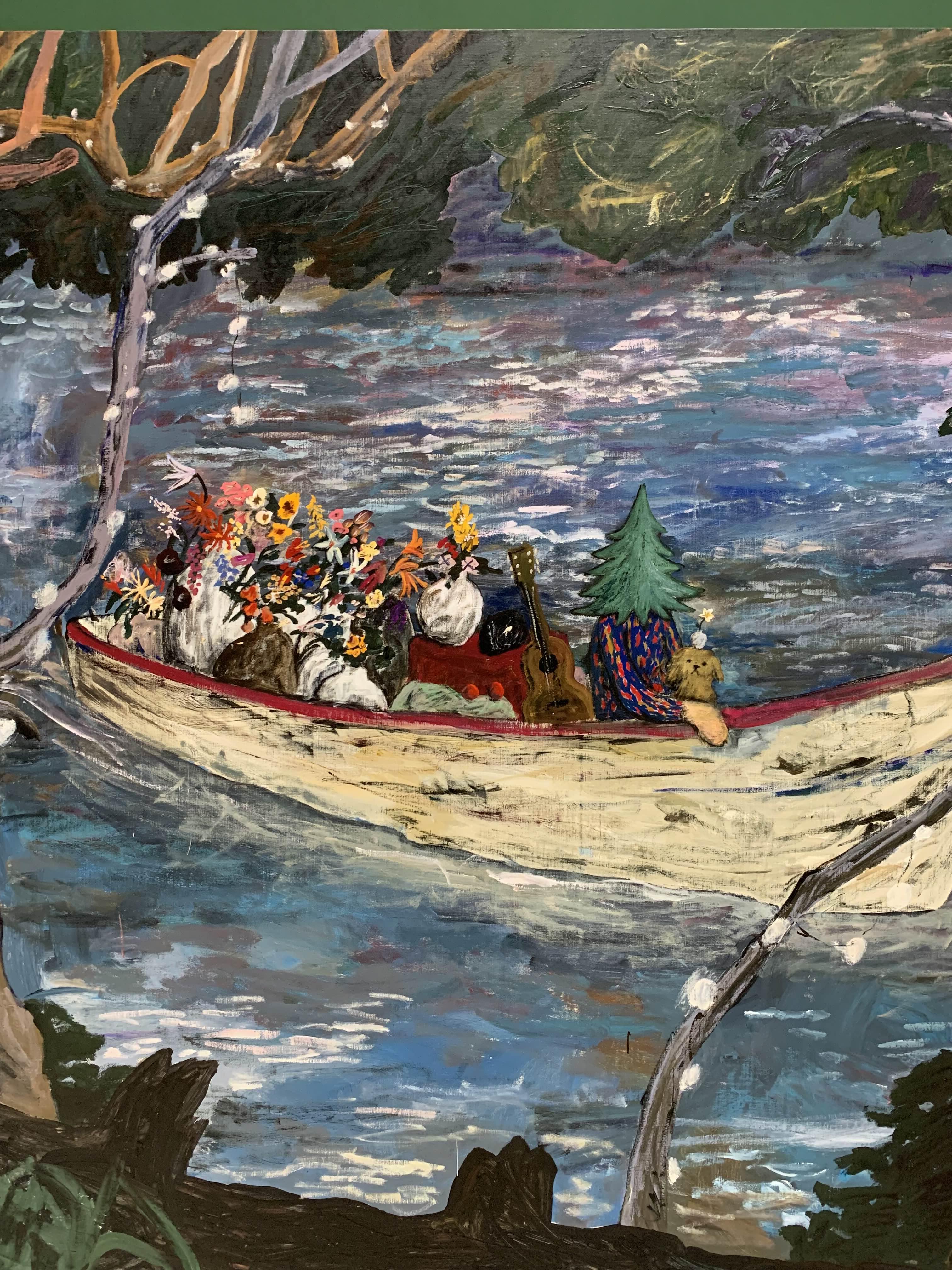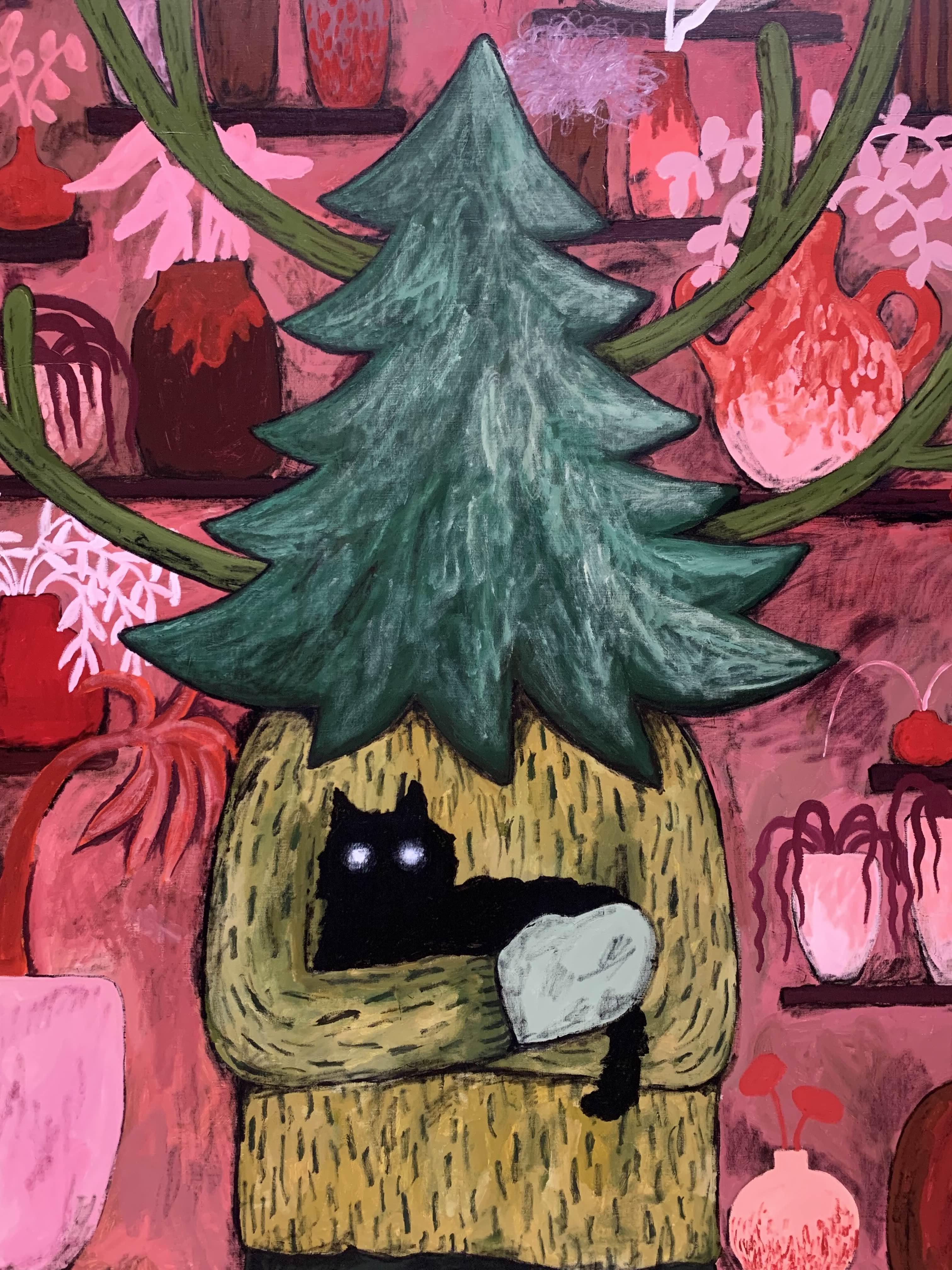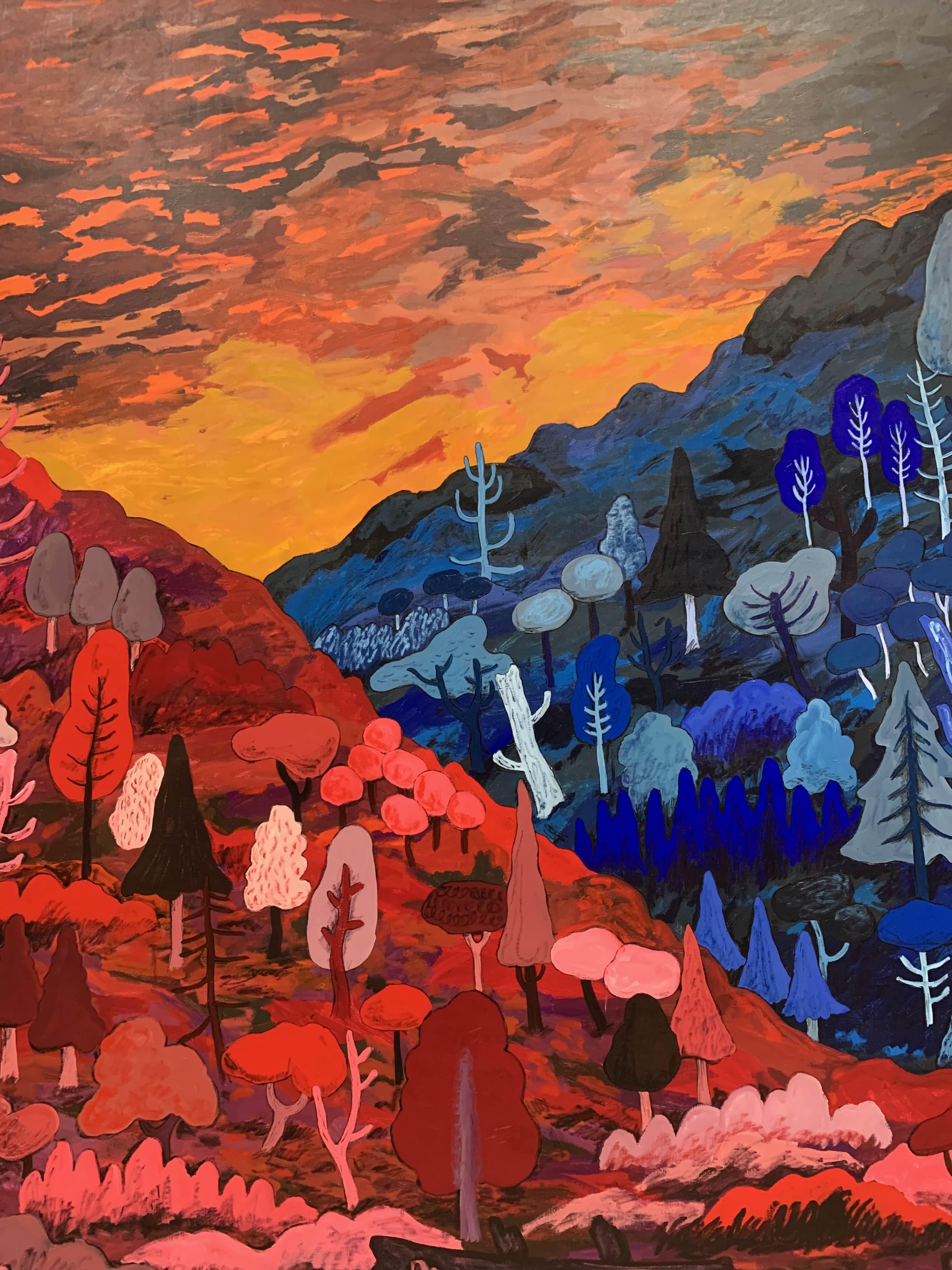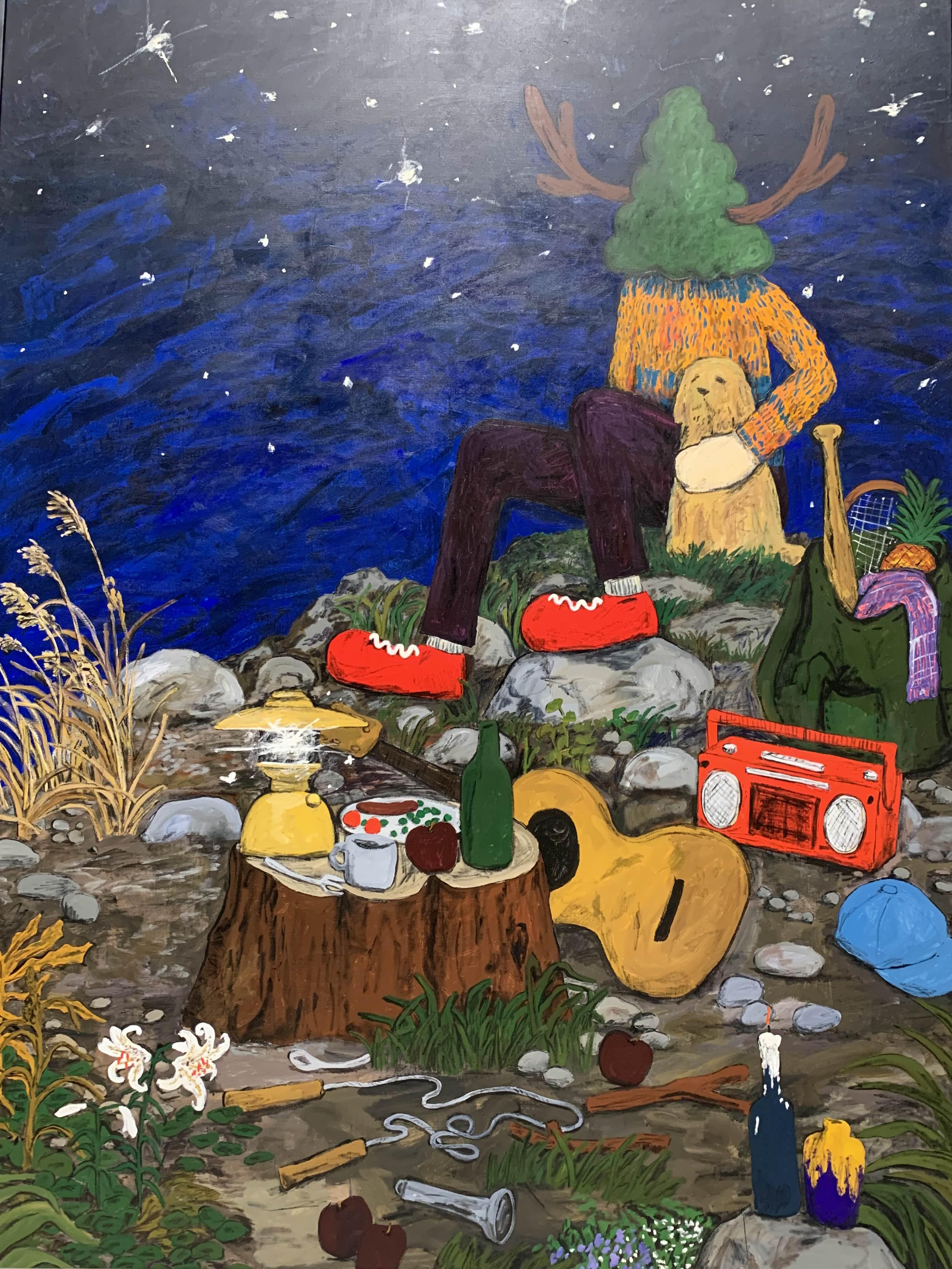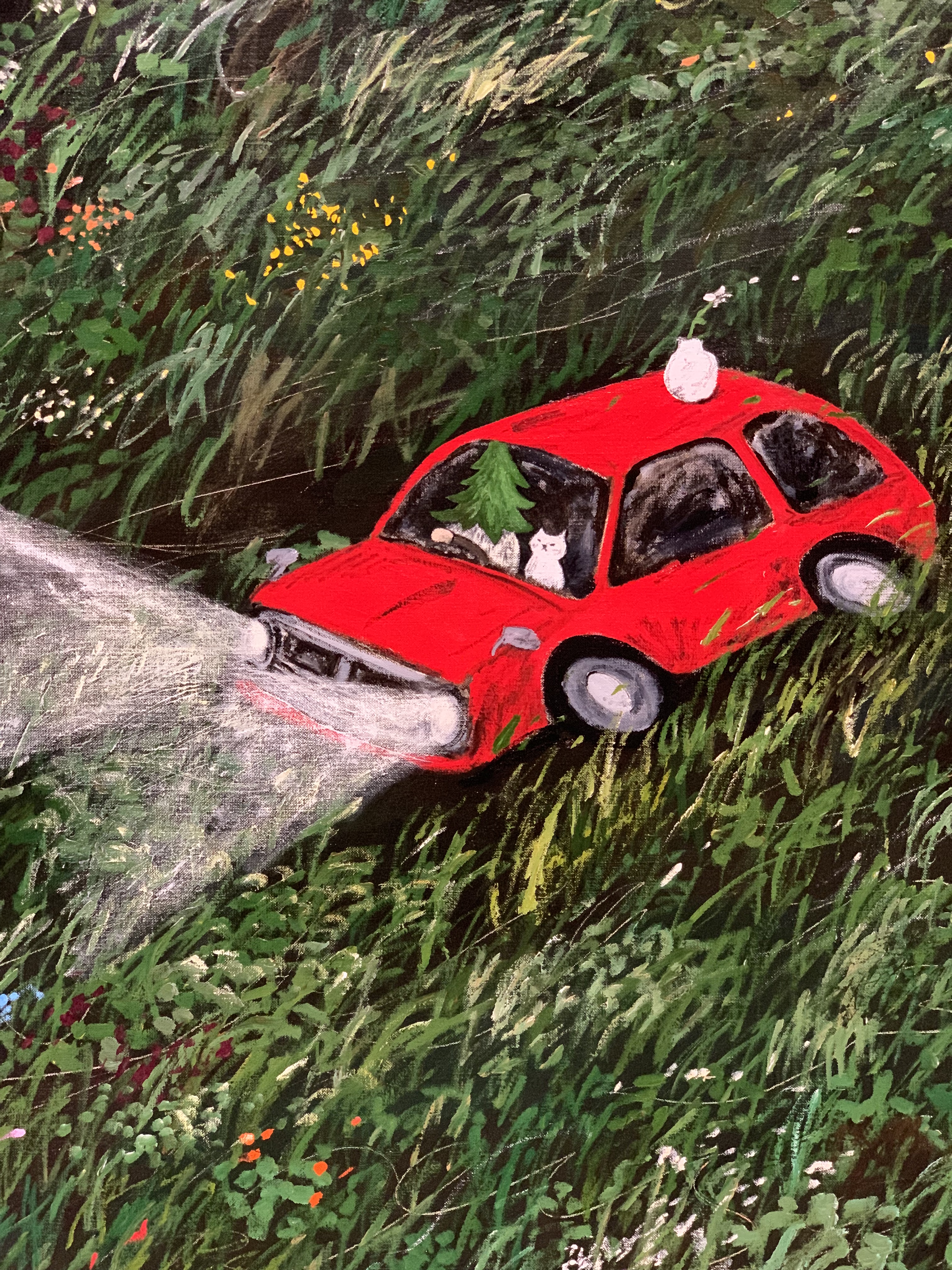 이번 전시에서는 혼종의 캐릭터는 여러가지 식물들과 어우러지는 여행을 떠납니다. <The Journey(Traveling Plants), 2023>은 길이가 10m에 이르고 높이 3m가 넘는 대작 회화입니다. 4개의 각기 다른 화면으로 구성된 이 작품 속 캐릭터 또는 숲은 어딘가에 위치합니다. 서로 다른 회화가 4개의 화폭으로 이뤄진 이 작품은 각각 구성을 달리하지만 서로의 색채를 공유하면서 연결됩니다. 때문에 이 작품은 파편적이면서도 공존하듯 내러티브를 이어갑니다. 씨앗이 경계를 넘어 서로 다른 자연에 뿌리를 내려 번성하고 이것은 마치 캠핑과 같은 여행으로 은유됩니다. 그리고 그 여행을 조력하는 새들 역시 함께합니다,