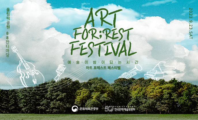 문화체육관광부와 한국문화예술위원회는 한국문화예술위원회 창립 50주년과 문화예술 후원 캠페인 '예술나무운동' 10주년을 맞이하여 오는 9월 23일 토요일 올림픽공원 88잔디마당에서 <아트 포레스트 페스티벌 ART FOR;REST FESTIVAL, 이하 아트 포레스트 페스티벌>을 개최합니다.