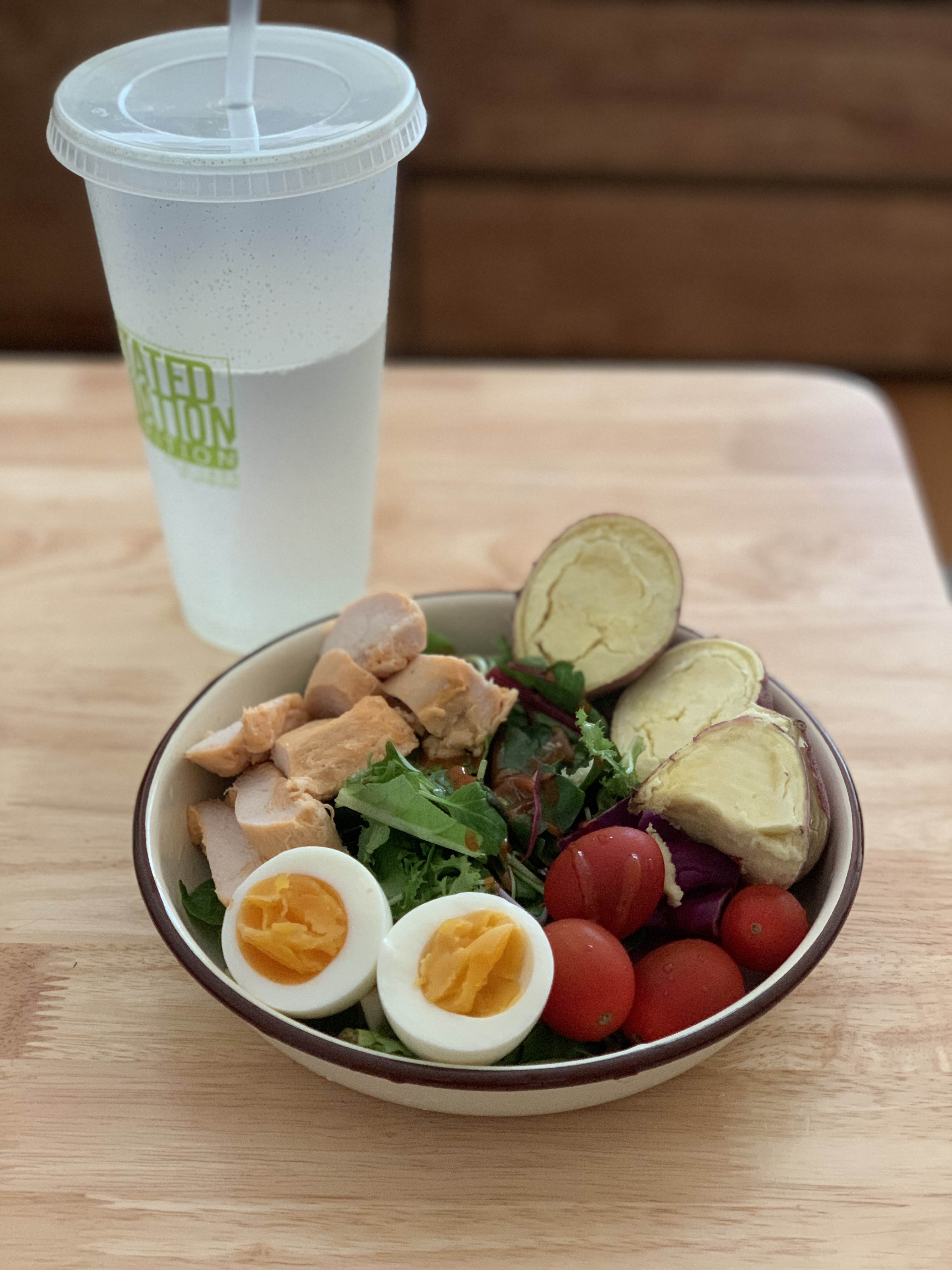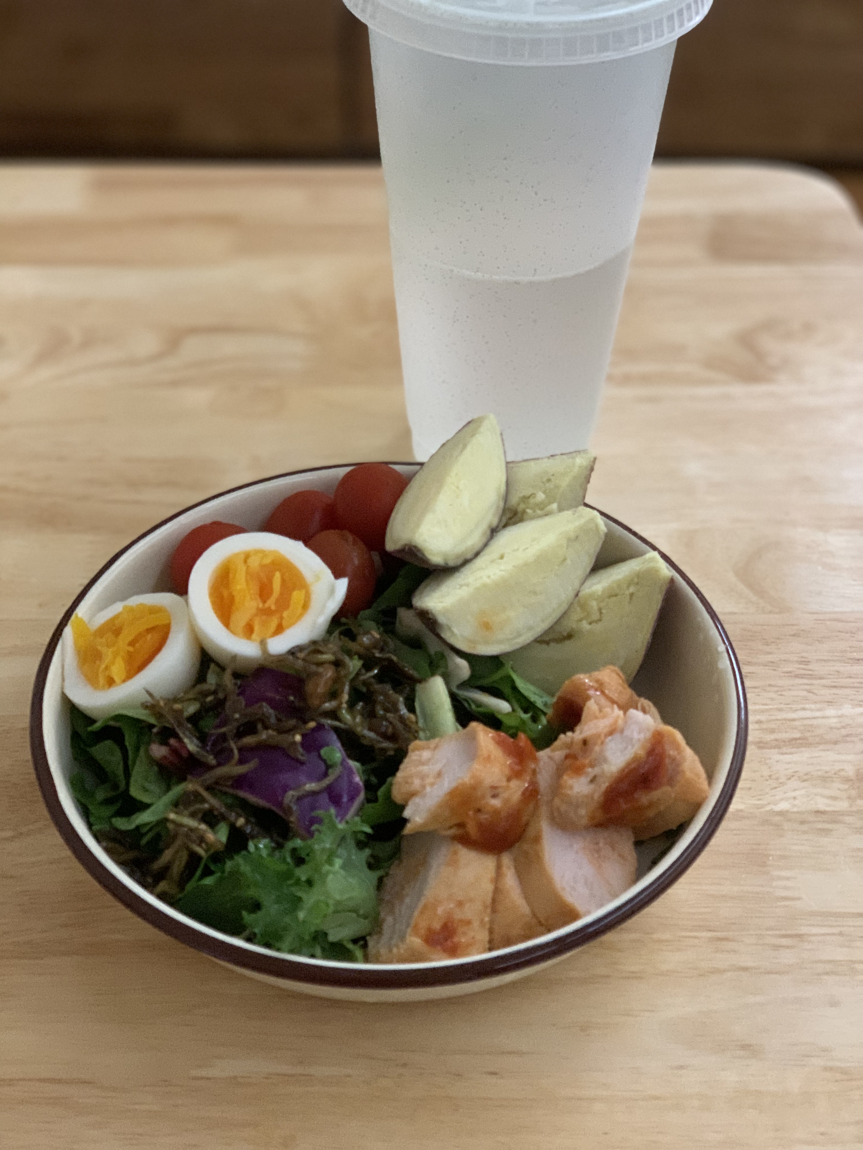 샐러드 + 방토 + 반숙란1 + #바르닭 수비드닭가슴살 오리지널 100g + 로맨틱브라운 #아담하구마 100g + 물 많이 섭취