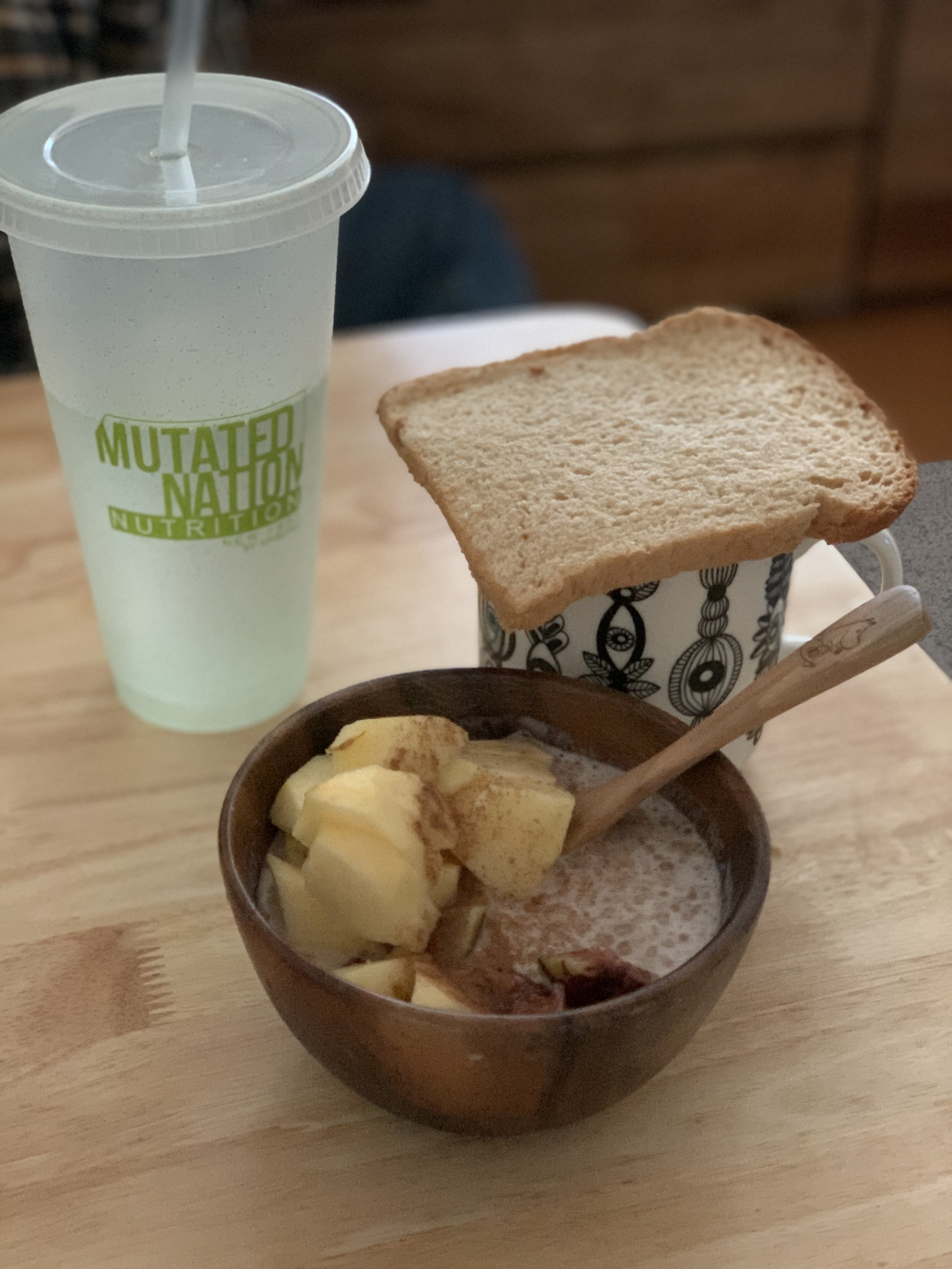 요거트가 남아서 요거트 국(플레인요거트 100g + #아이소갓 프로틴파우더 10g + 사과1/4 + 무화과1) + 통밀빵2조각 + 커피