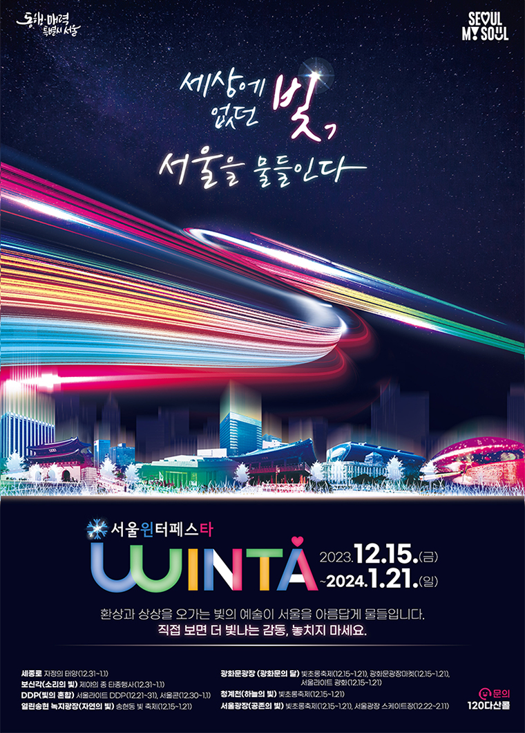 <서울윈타>는 서울 대표 매력포인트 7곳(DDP~보신각~세종대로~광화문광장~열린송현녹지광장~청계천~서울광장)에서 펼쳐지는 10개의 축제와 행사를 하나로 이은 초대형 도심 겨울축제입니다. '세상에 없던 빛, 서울을 물들인다'는 슬로건 아래 '빛'을 공통의 소재로 하여 2023년 12월 15일부터 2024년 1월 21일까지 38일간 미디어아트, 빛 전시 등을 통해 서울의 겨울밤을 화려한 빛의 향연으로 물들입니다.