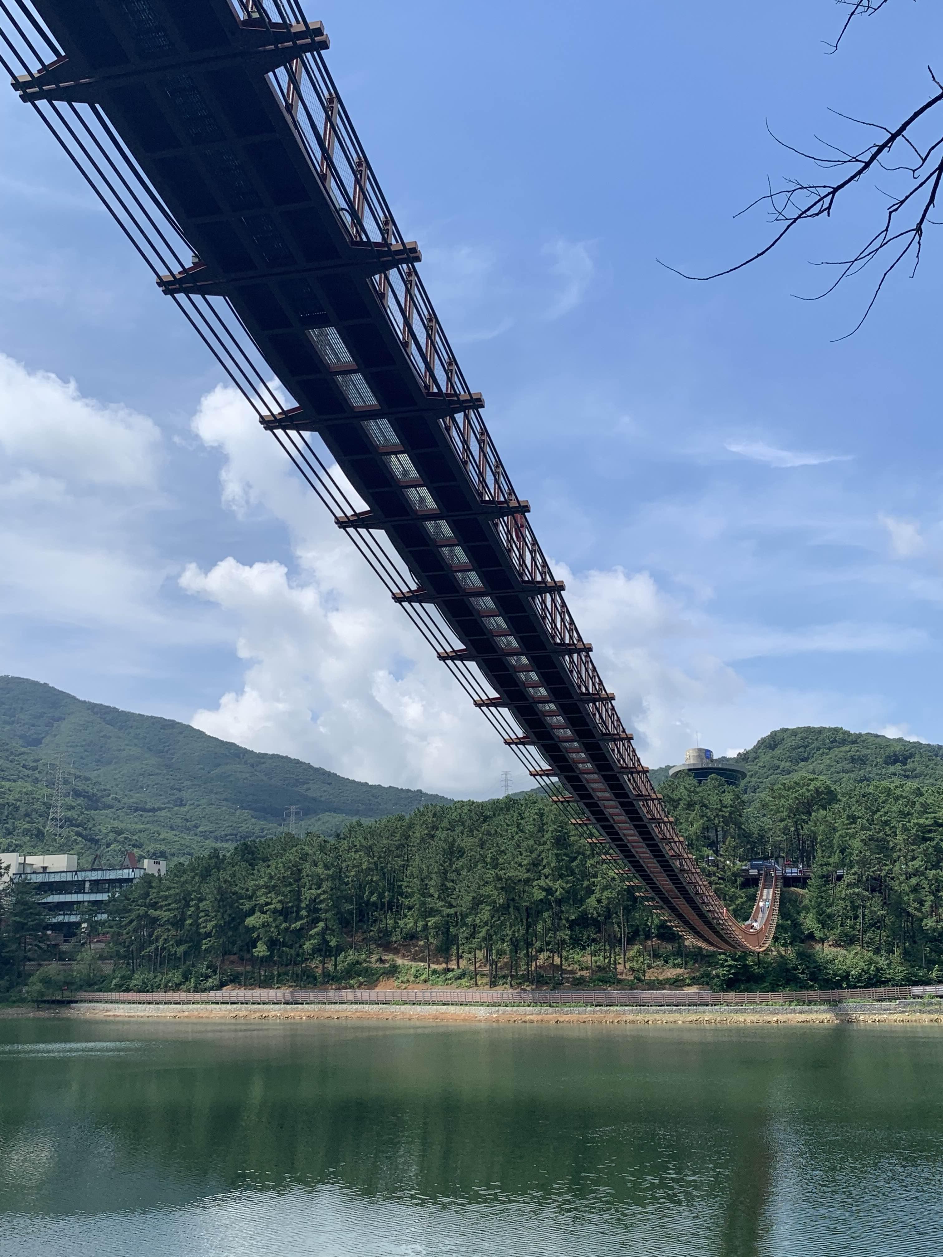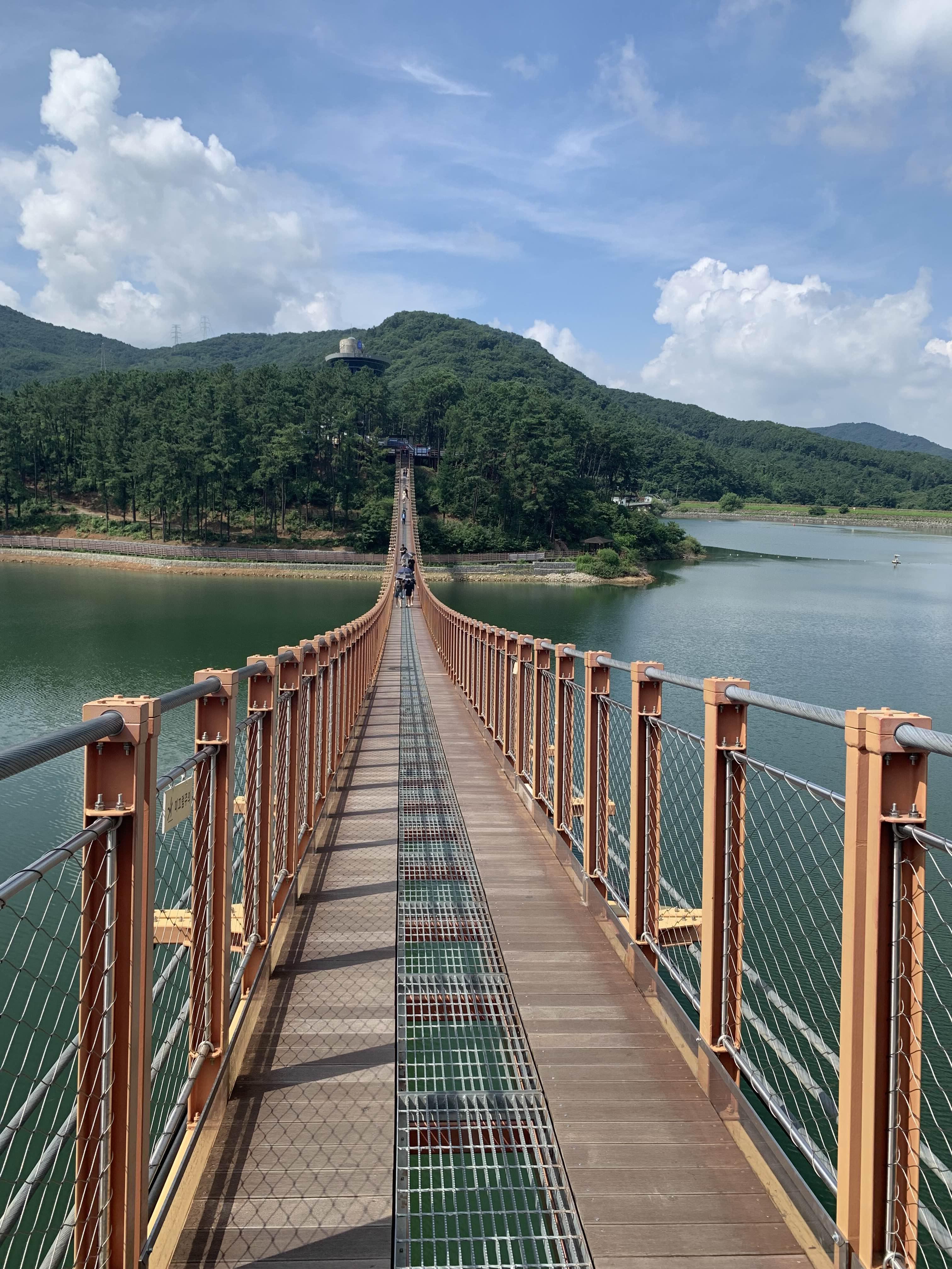 당연히 출렁다리는 가봐야 한다 해서 땡볕이었지만, 다리를 건너면서 사진도 찍고 탁 트인 호수 전경도 둘러보았답니다.