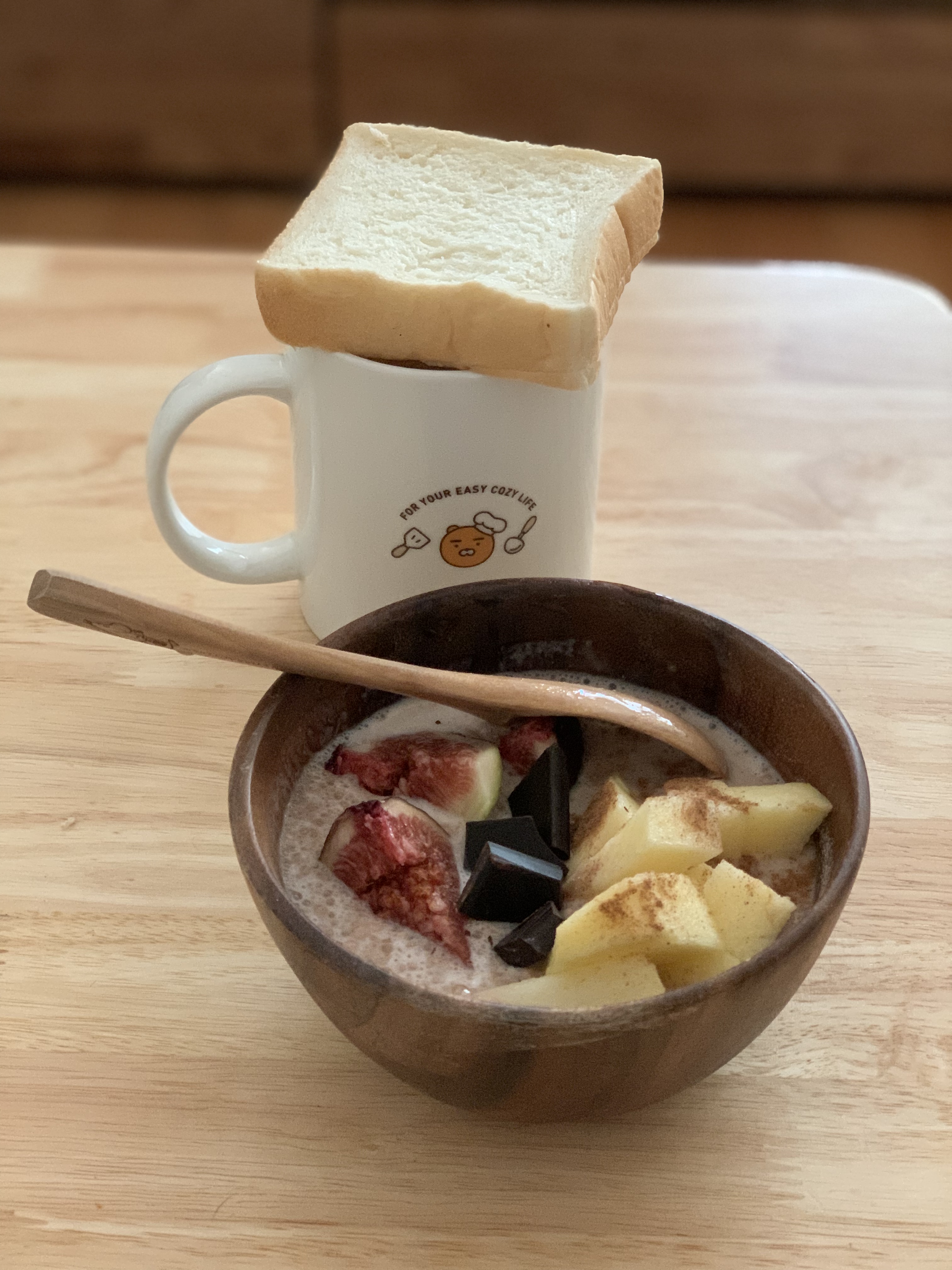 요거트국 (플레인요거트 90g + 사과1/4 + 무화과1 + 프로틴파우더 15g + 다크초코90% 1조각)
