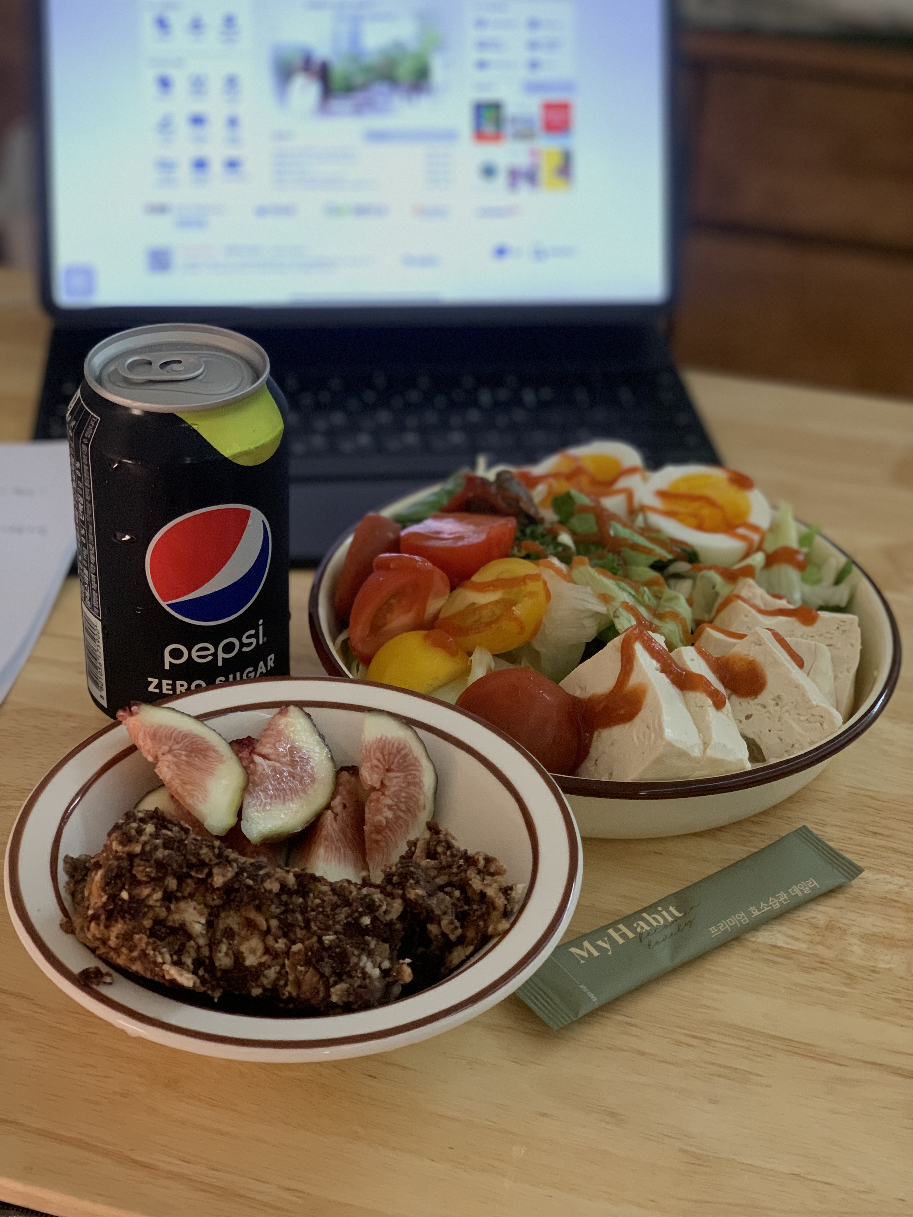 두부 150g + 샐러드 + 토마토 + 반숙란1 + 햇시 호박팥시루 + 무화과 + 제로팹시