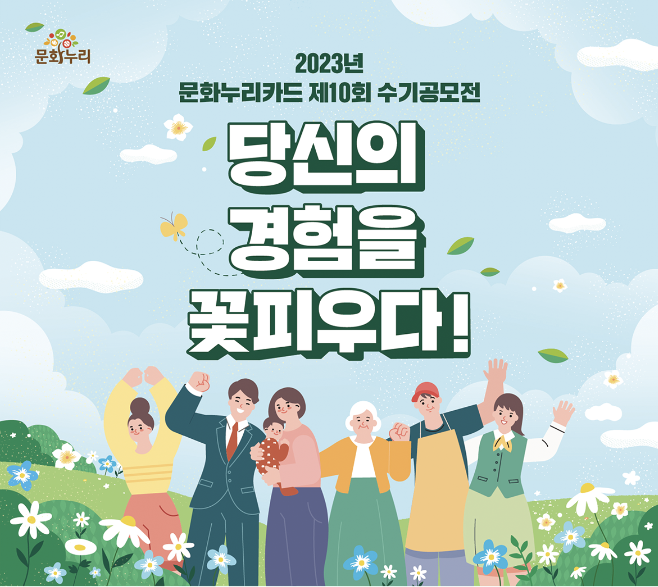 한국문화예술위원회와 문화체육관광부에서는 2023년 문화누리카드 제10회 수기공모전 '당신의 경험을 꽃 피우다'의 참여자들을 기다립니다. 문화누리카드를 통해서 경험한 감동 스토리, 문화누리카드가 가진 사회적 가치 등을 사례로 발굴함으로써, 문화누리카드 사업의 공익성과 효과성을 확산하기 위한 목적의 공모전입니다.