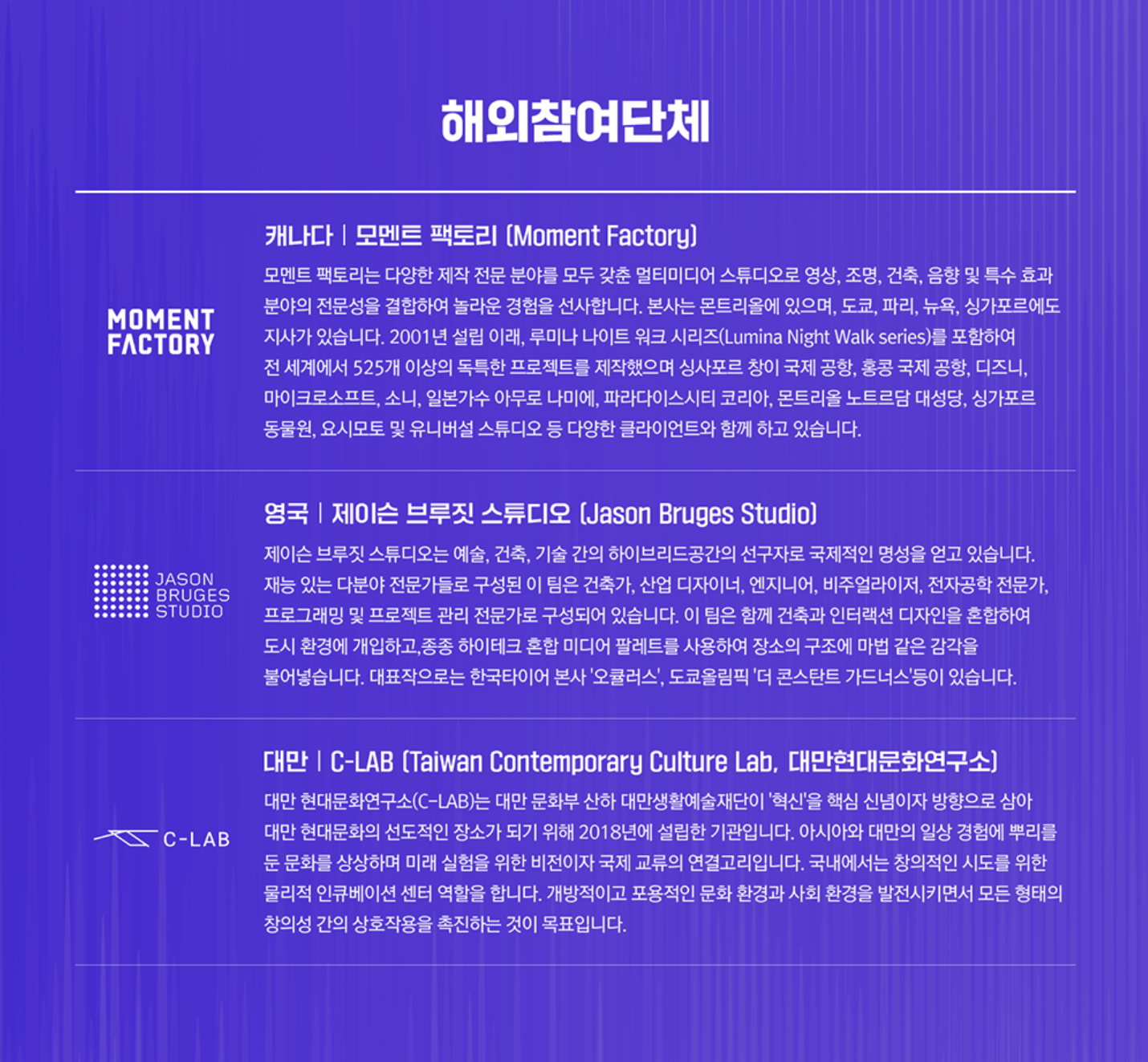 이번 2023년 아르코 예술기술융합 국제컨퍼런스에서는 세계 최고의 멀티미디어 엔터테인먼트 스튜디오인 캐나다 모멘트 팩토리 Moment Factory, 영국 제이슨 브루짓 스튜디오 Jason Bruges Studio, 대만 씨랩 C-Lab의 크리에이터들을 초청하여 최근 경향과 전문 분야의 대표작업 사례들을 들어봅니다.
